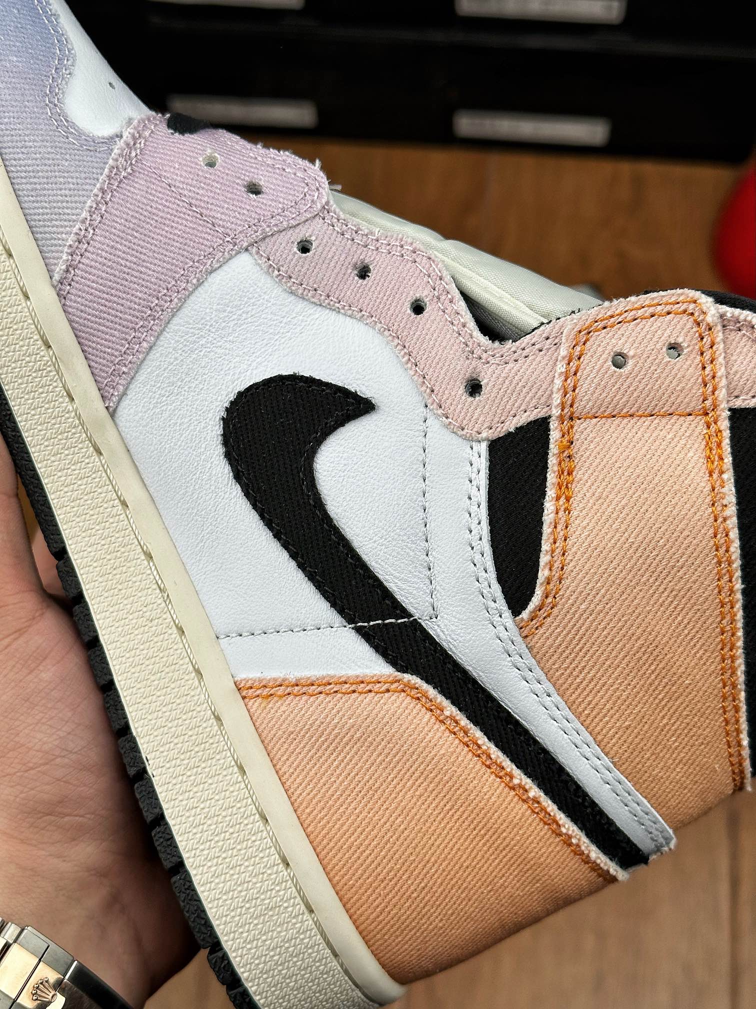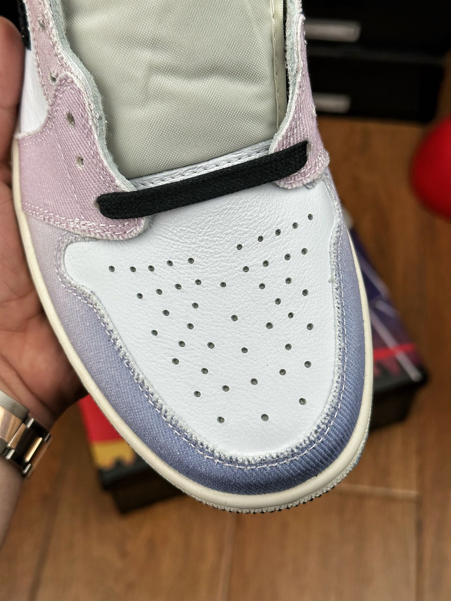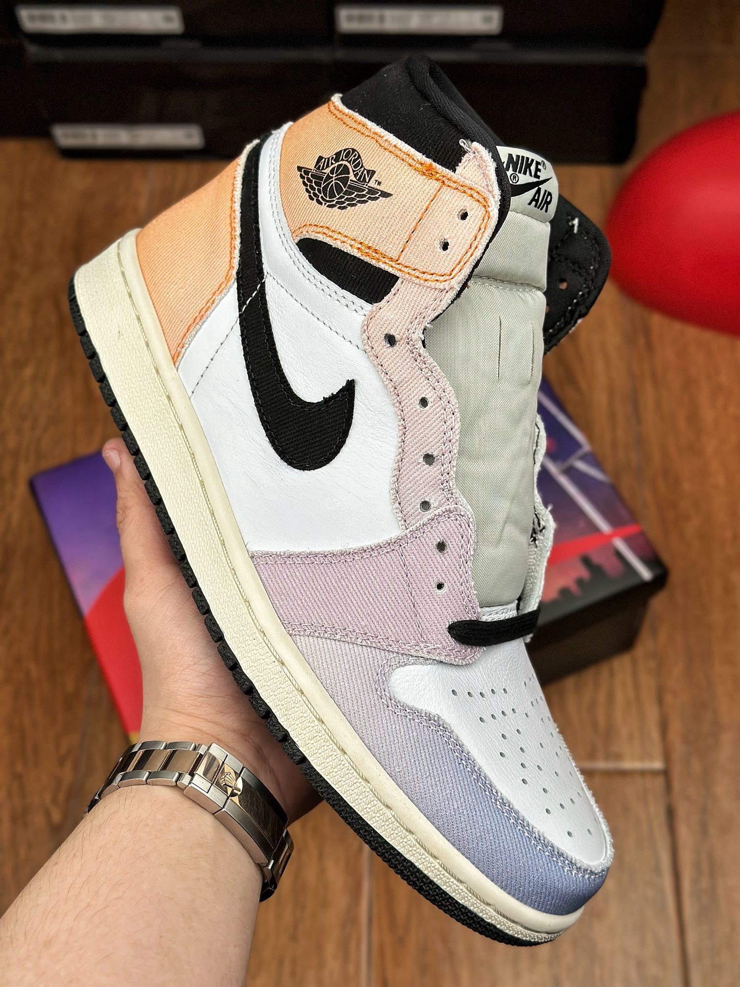 Jordan 1 High „Skyline“ byly vydány v roce 2023. Tenisky mají svršek z bílé kůže a duhové látky pro jedinečný vzhled. Na vrchní části tenisky nalezneme tradiční černé Wings logo.