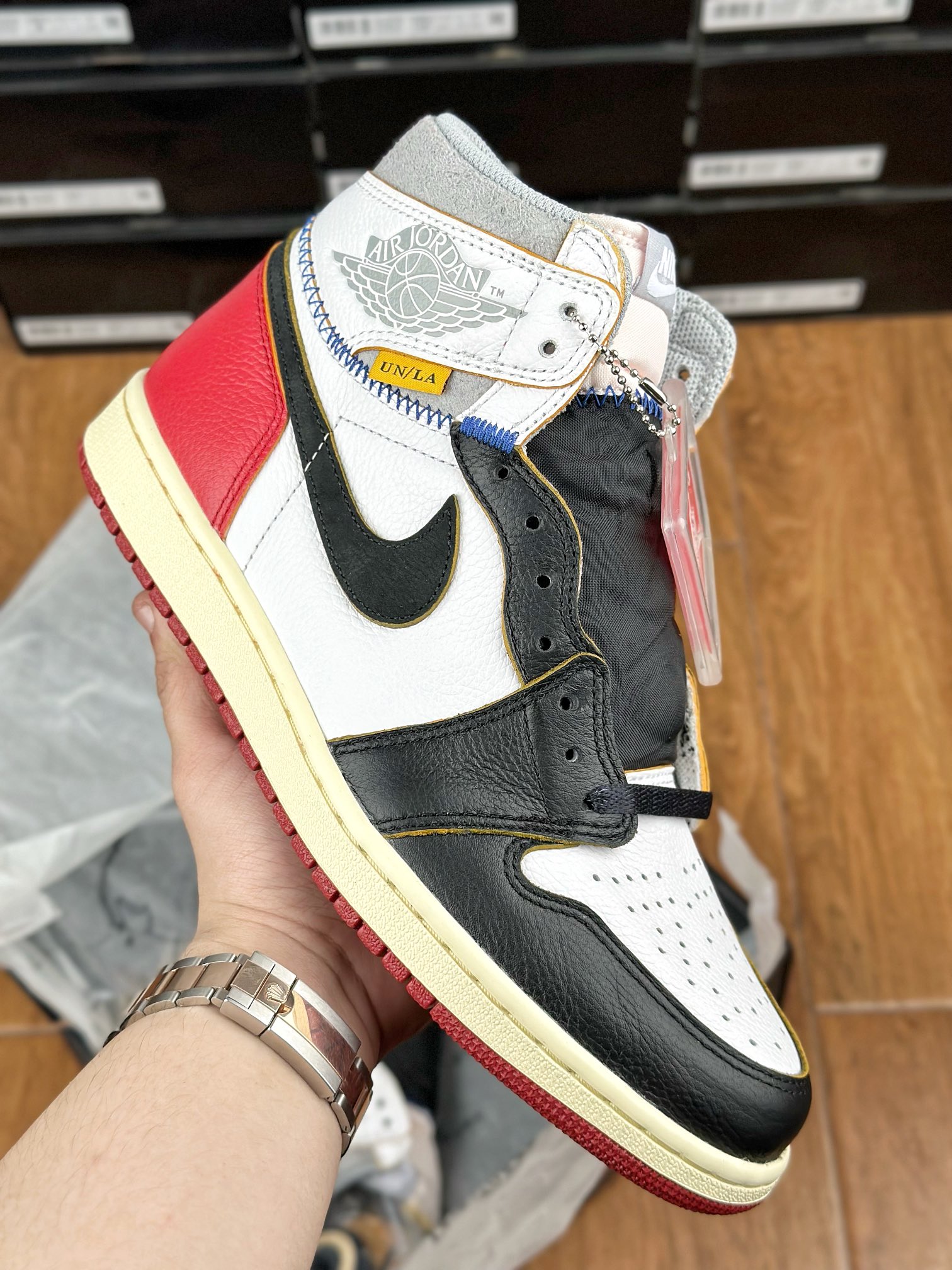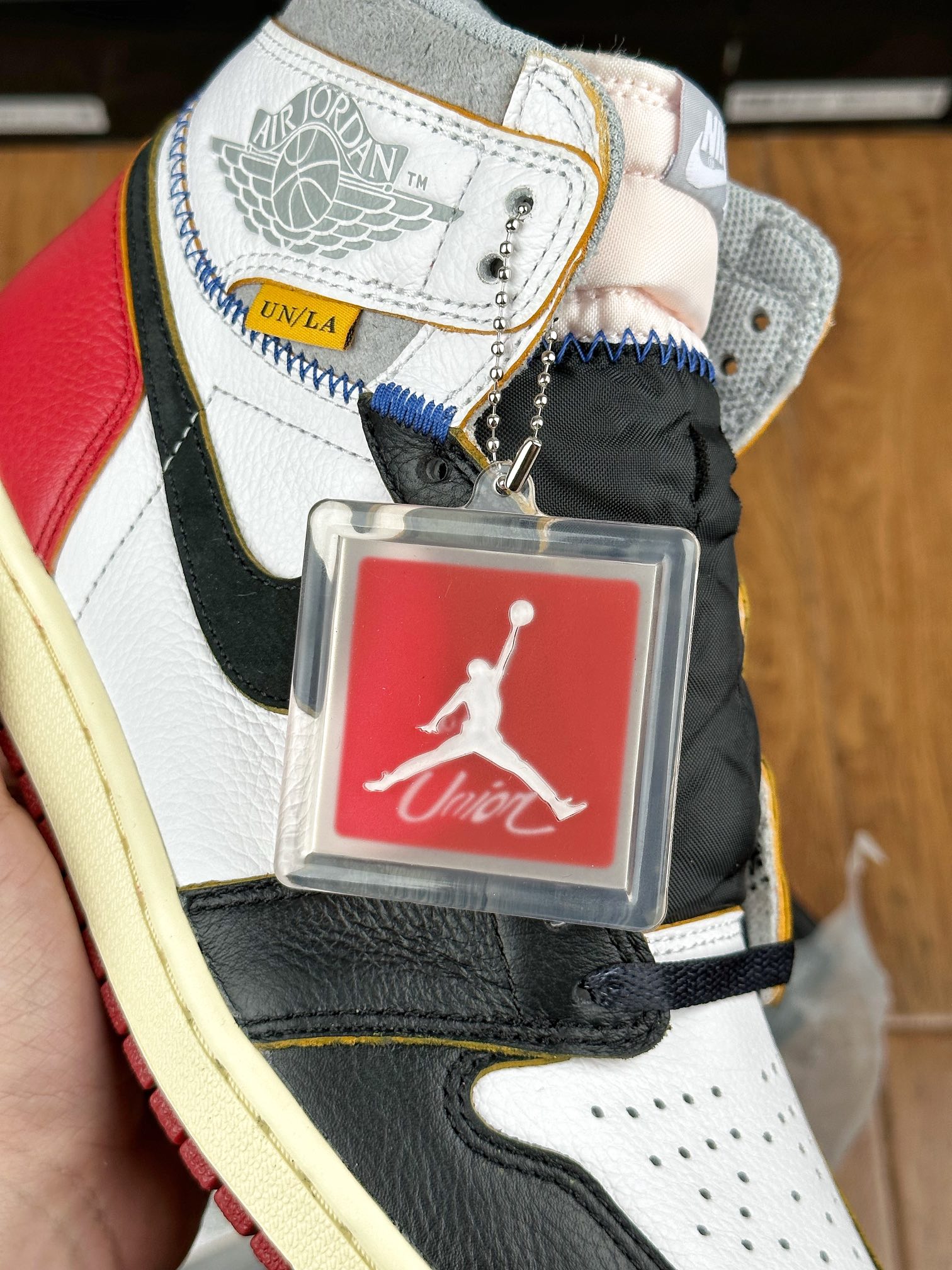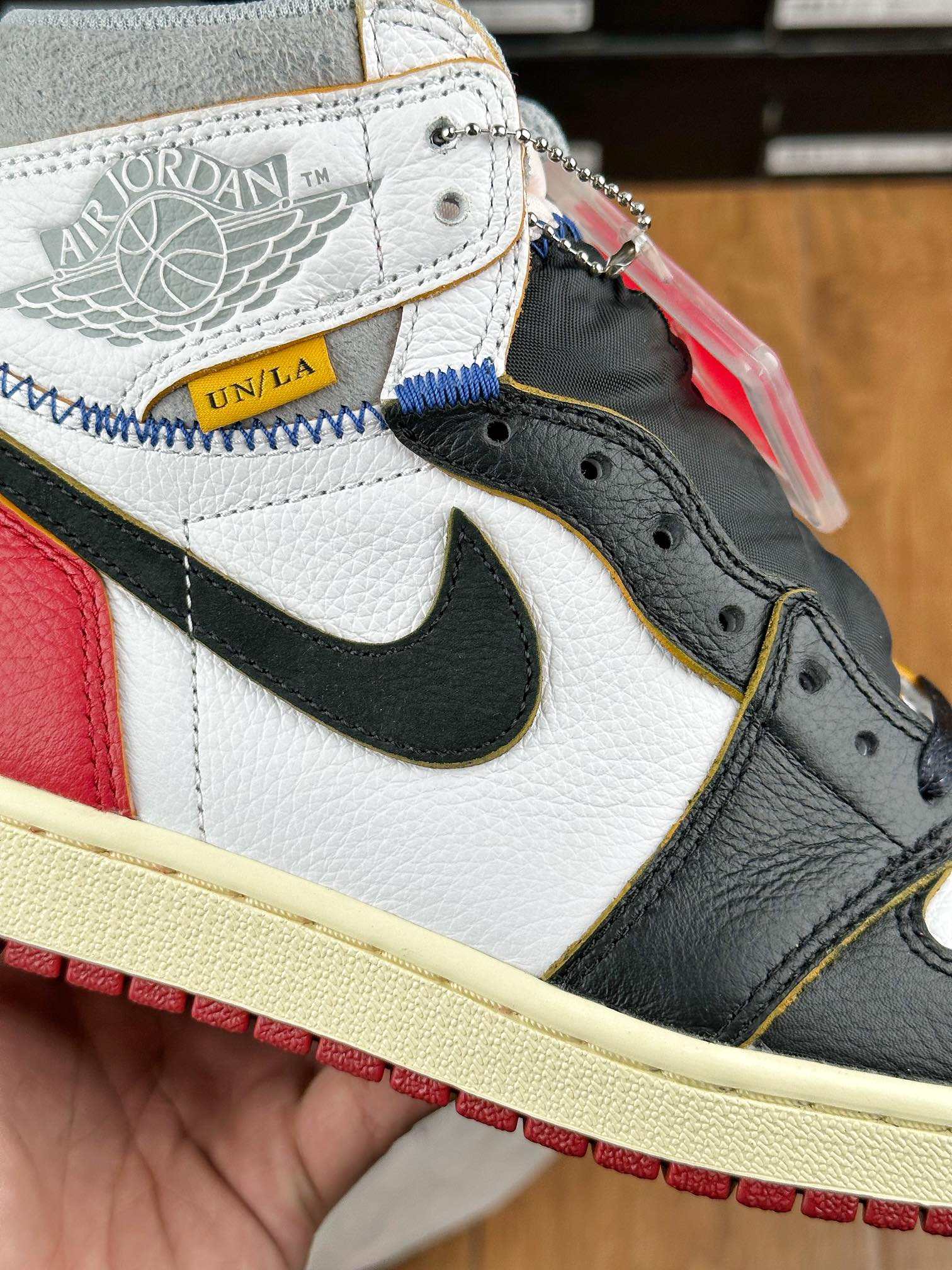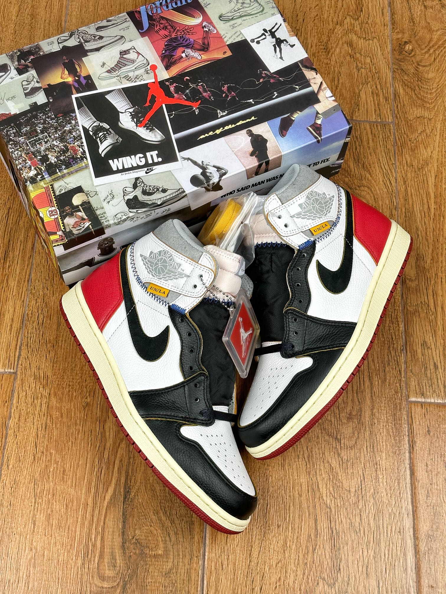 Model Air Jordan 1 High v červeném, bílem a černém “Black Toe” provedení v kolaboraci se značkou z Los Angeles – Union LA. Tyto Jordany jsou jedny z nejvíce limitovaných a exkluzivních tenisek vůbec. Napodobují old school/vintage vizuální zpracování jako právě tenisky, které Michael Jordan v roce 1985 obul na palubovku.