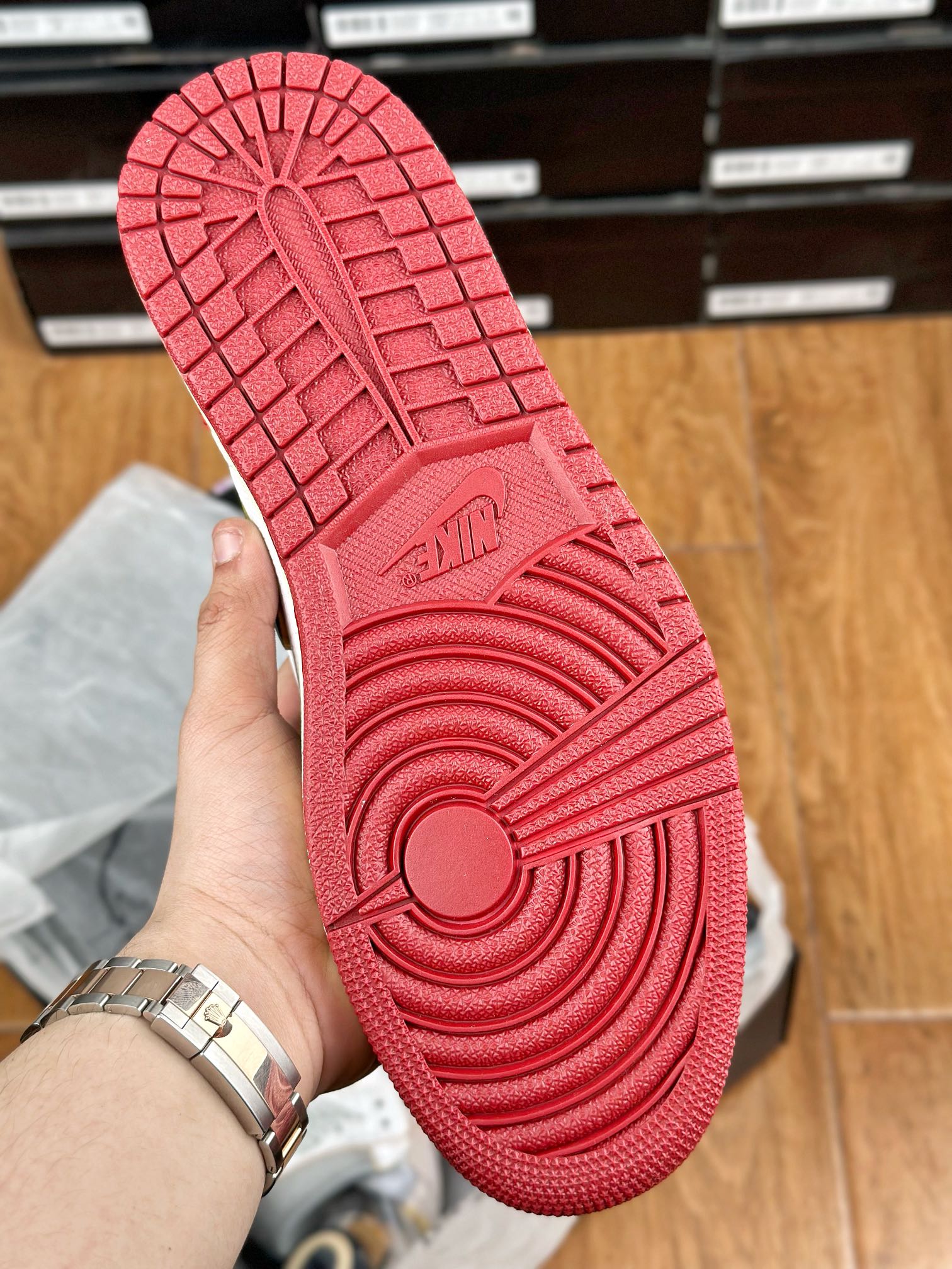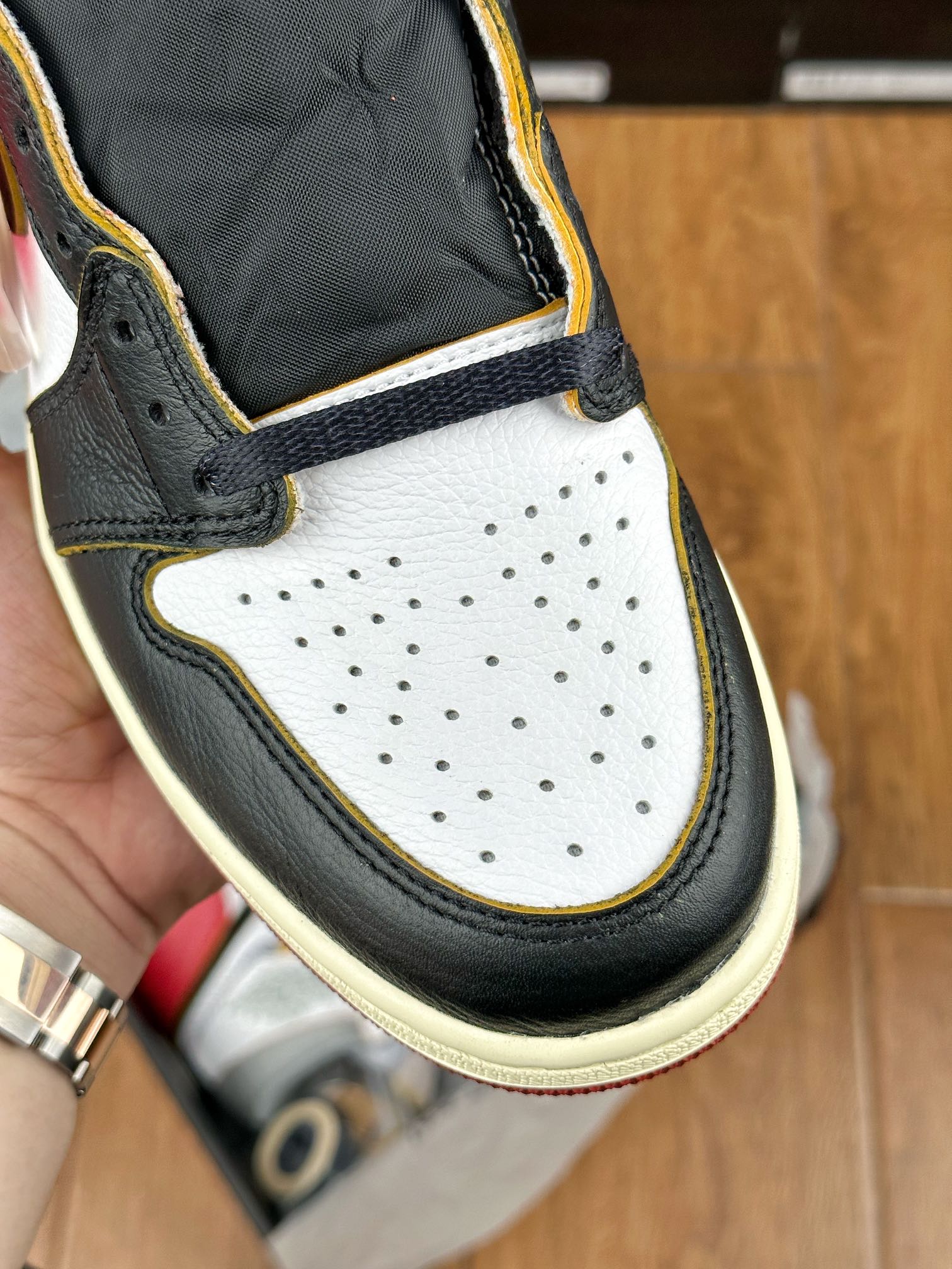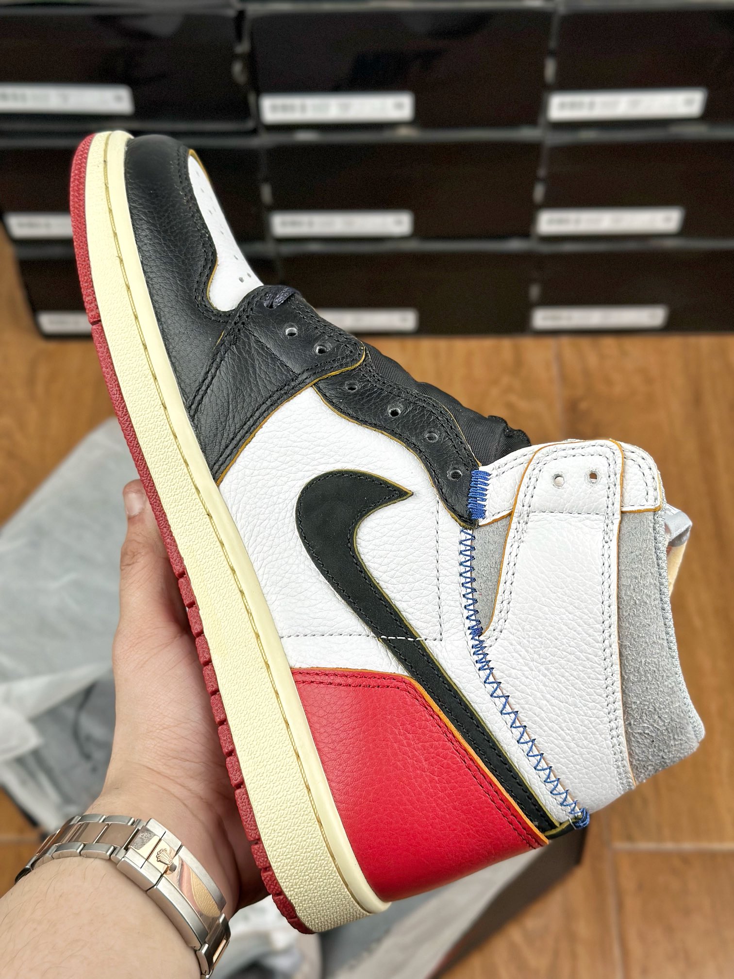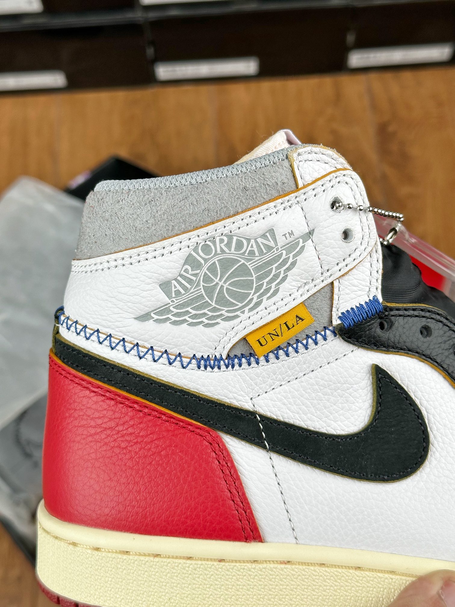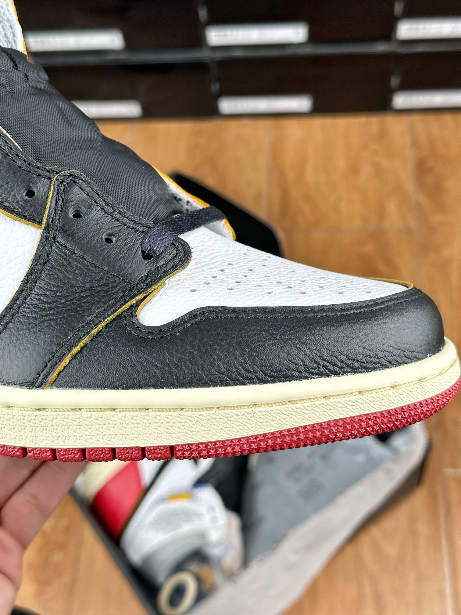 Model Air Jordan 1 High v červeném, bílem a černém “Black Toe” provedení v kolaboraci se značkou z Los Angeles – Union LA. Tyto Jordany jsou jedny z nejvíce limitovaných a exkluzivních tenisek vůbec. Napodobují old school/vintage vizuální zpracování jako právě tenisky, které Michael Jordan v roce 1985 obul na palubovku.