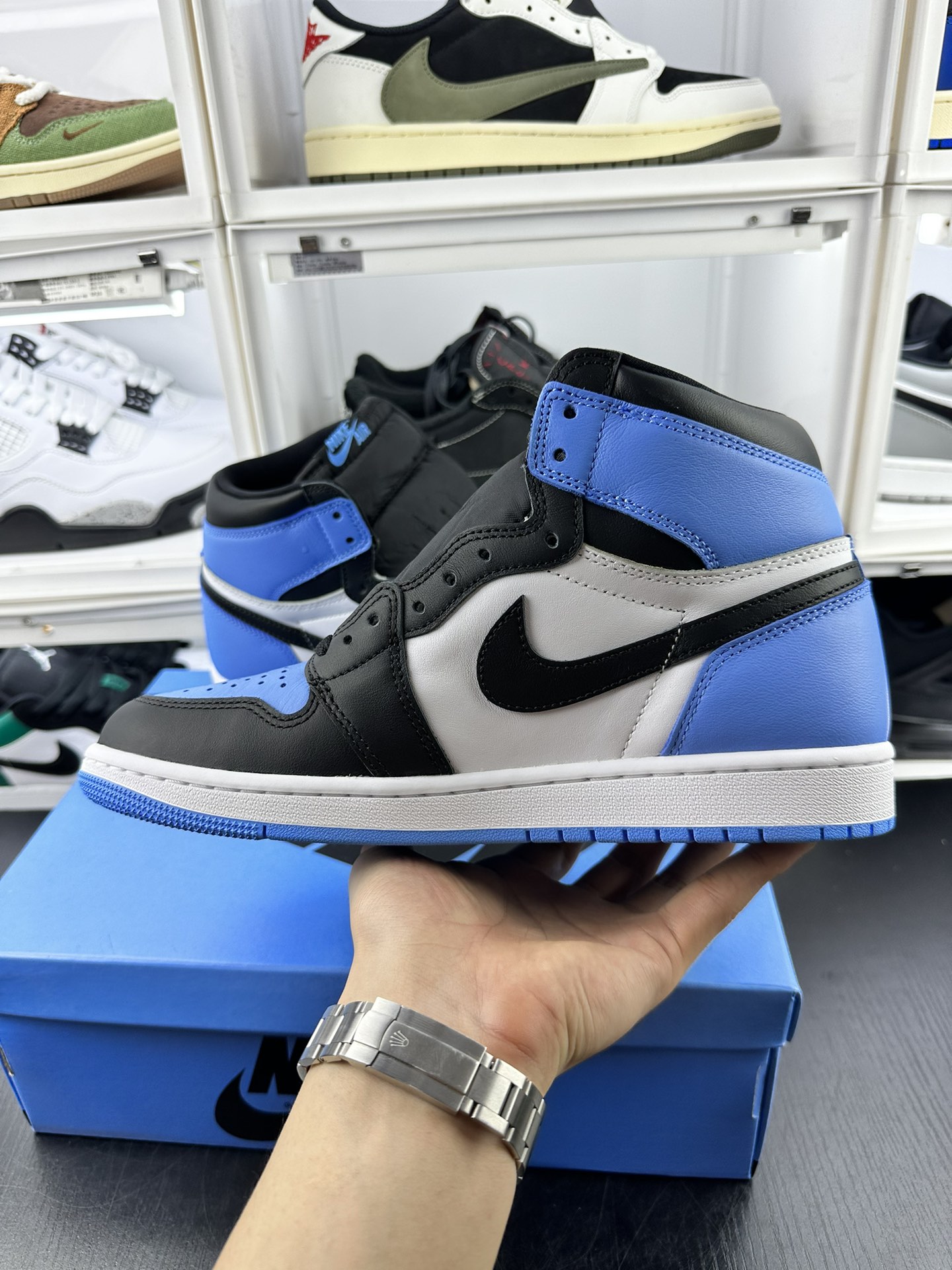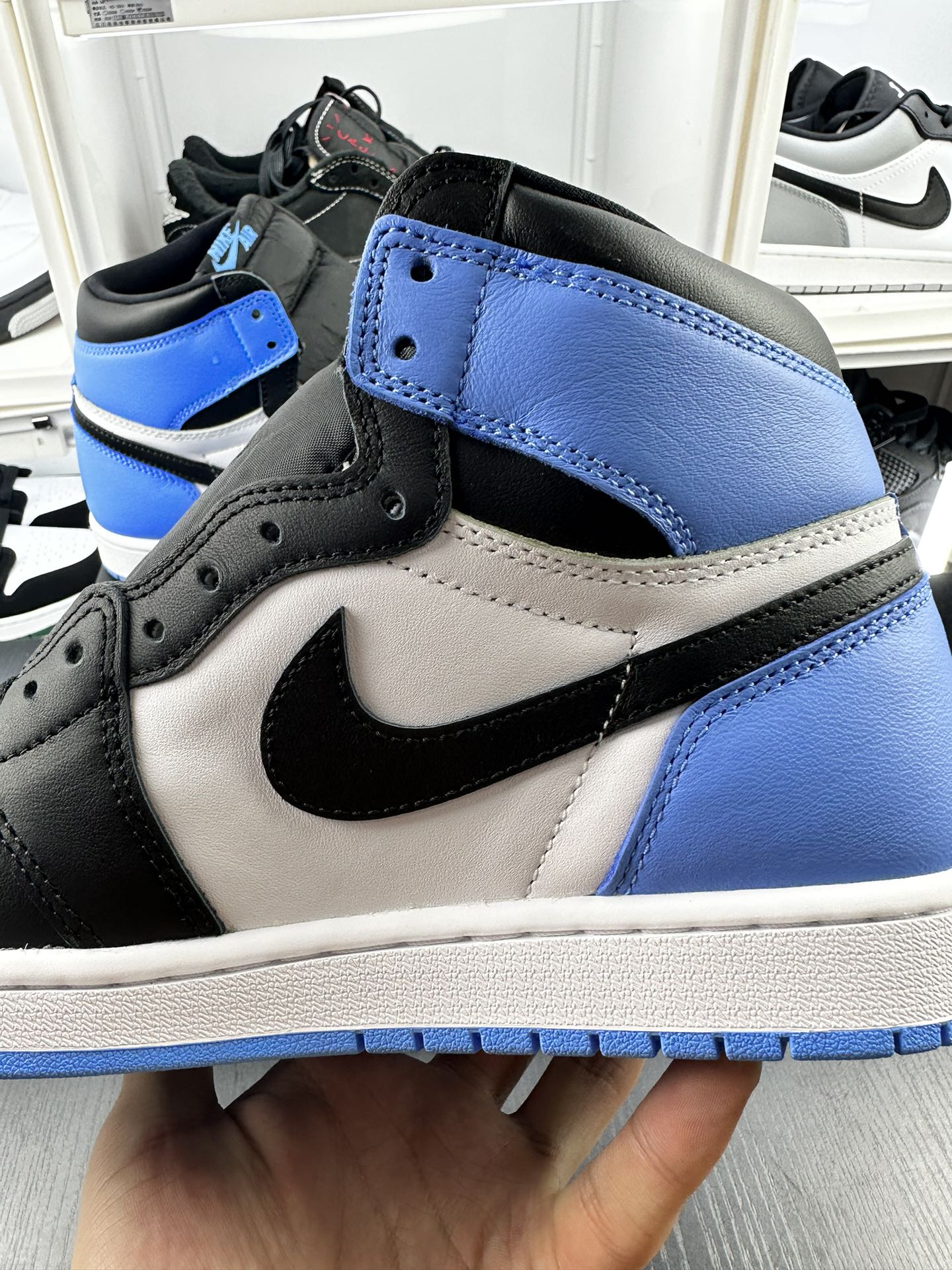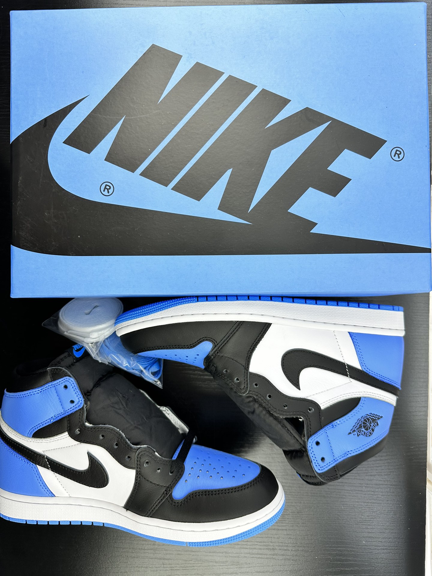 Jordan 1 High OG UNC Toe předvádí University Blue na přední části boty a na patě, což vytváří dokonalý kontrast s čistou bílou kůží na středním panelu a černou na logu Swoosh a kotníkové manžetě. Tyto tenisky stojí na čistě bílé střední podešvi, kterou vyvažuje živá University Blue podrážka, čímž vzniká působivá vizuální rovnováha.