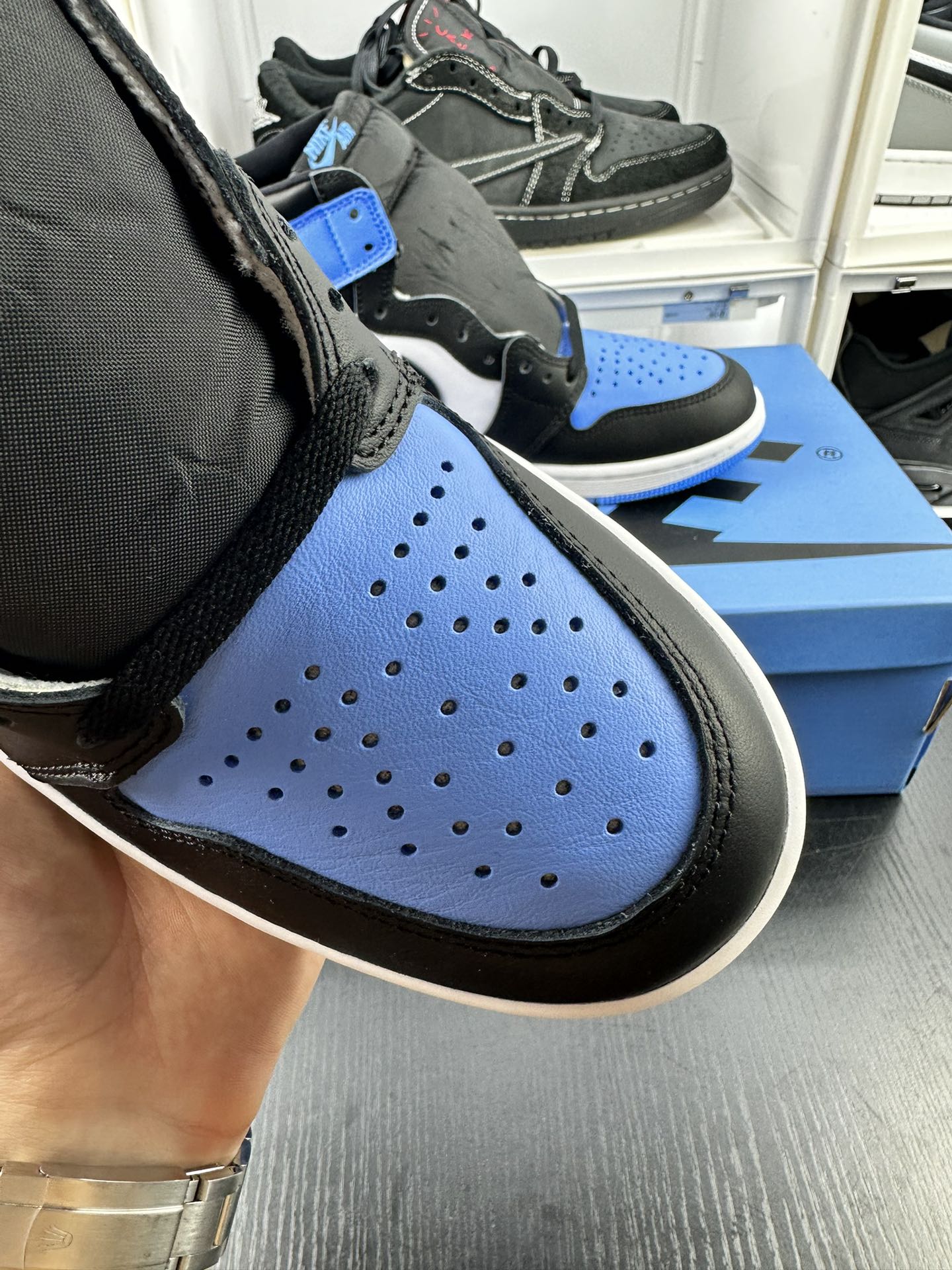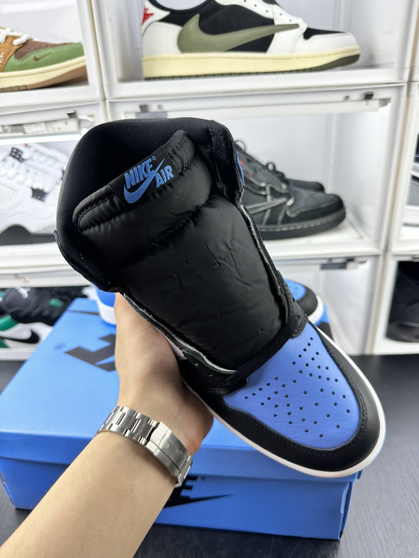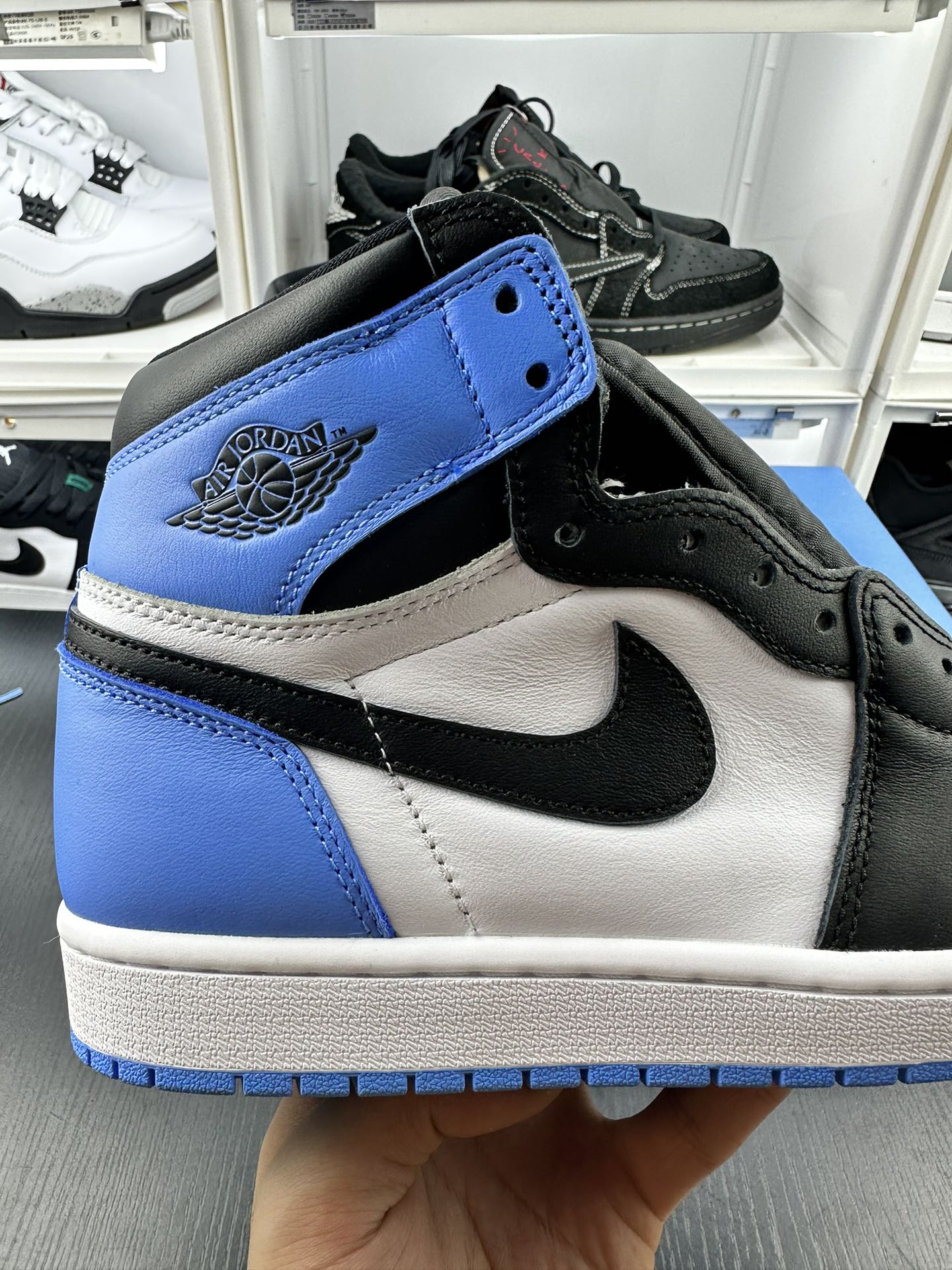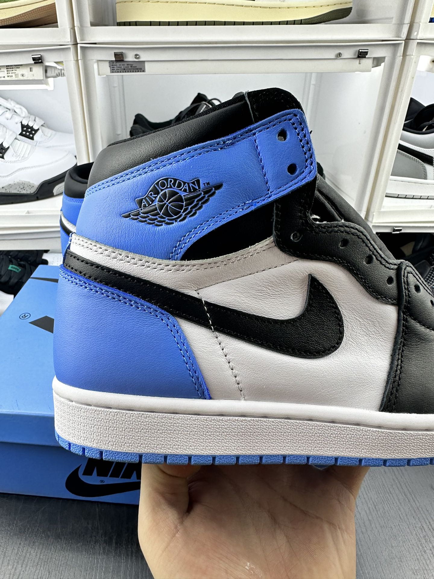 Jordan 1 High OG UNC Toe předvádí University Blue na přední části boty a na patě, což vytváří dokonalý kontrast s čistou bílou kůží na středním panelu a černou na logu Swoosh a kotníkové manžetě. Tyto tenisky stojí na čistě bílé střední podešvi, kterou vyvažuje živá University Blue podrážka, čímž vzniká působivá vizuální rovnováha.