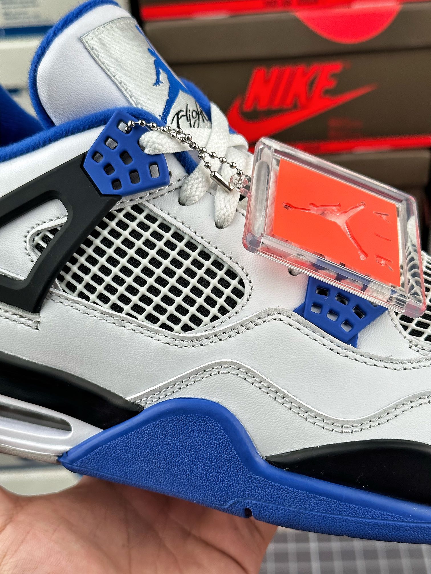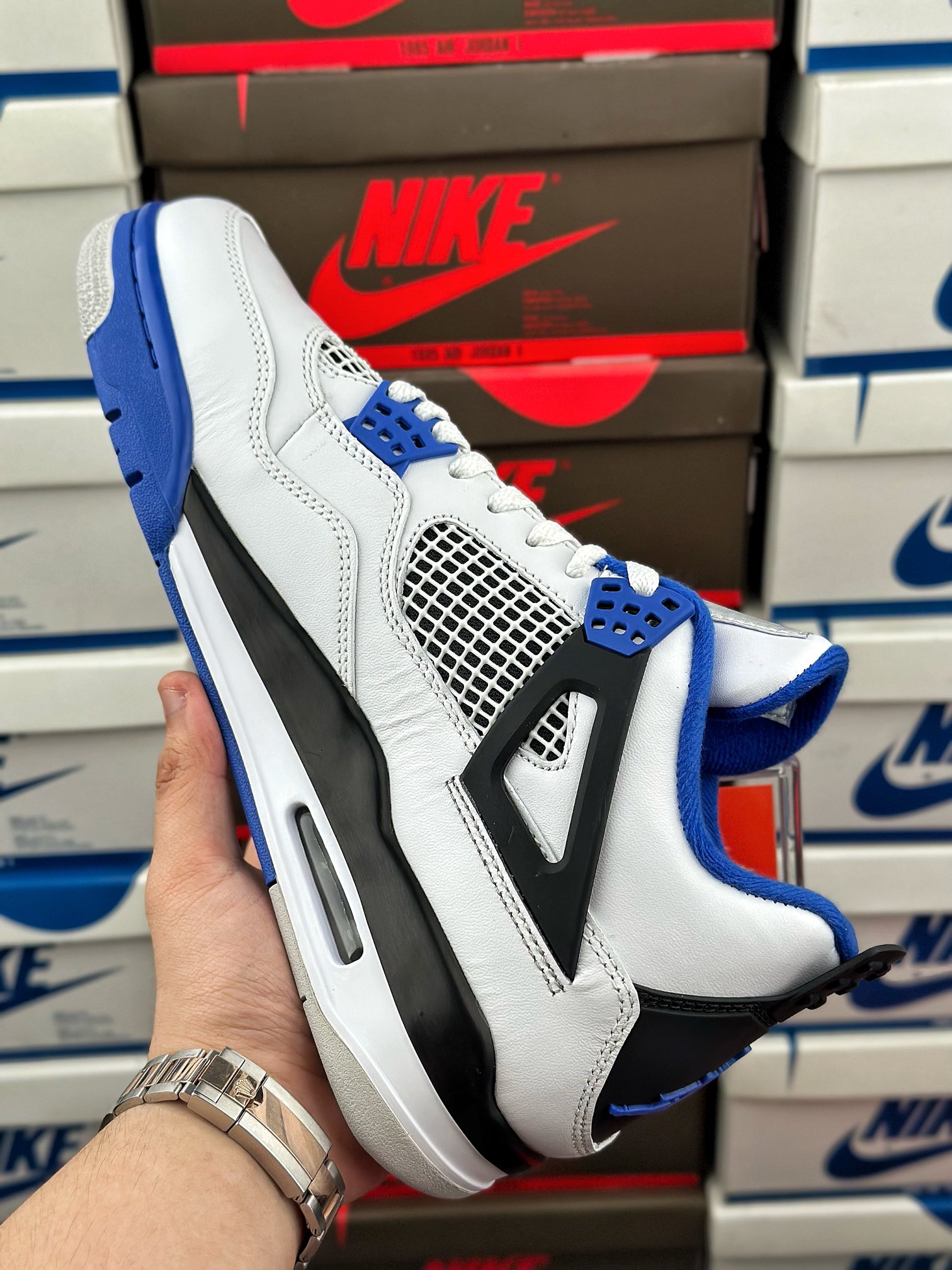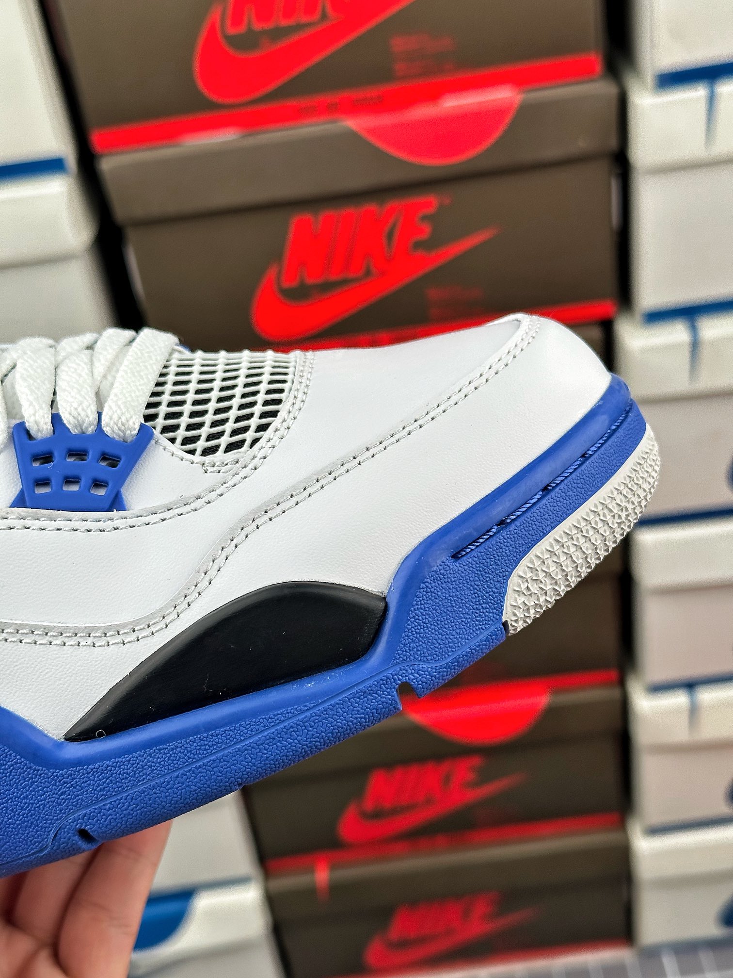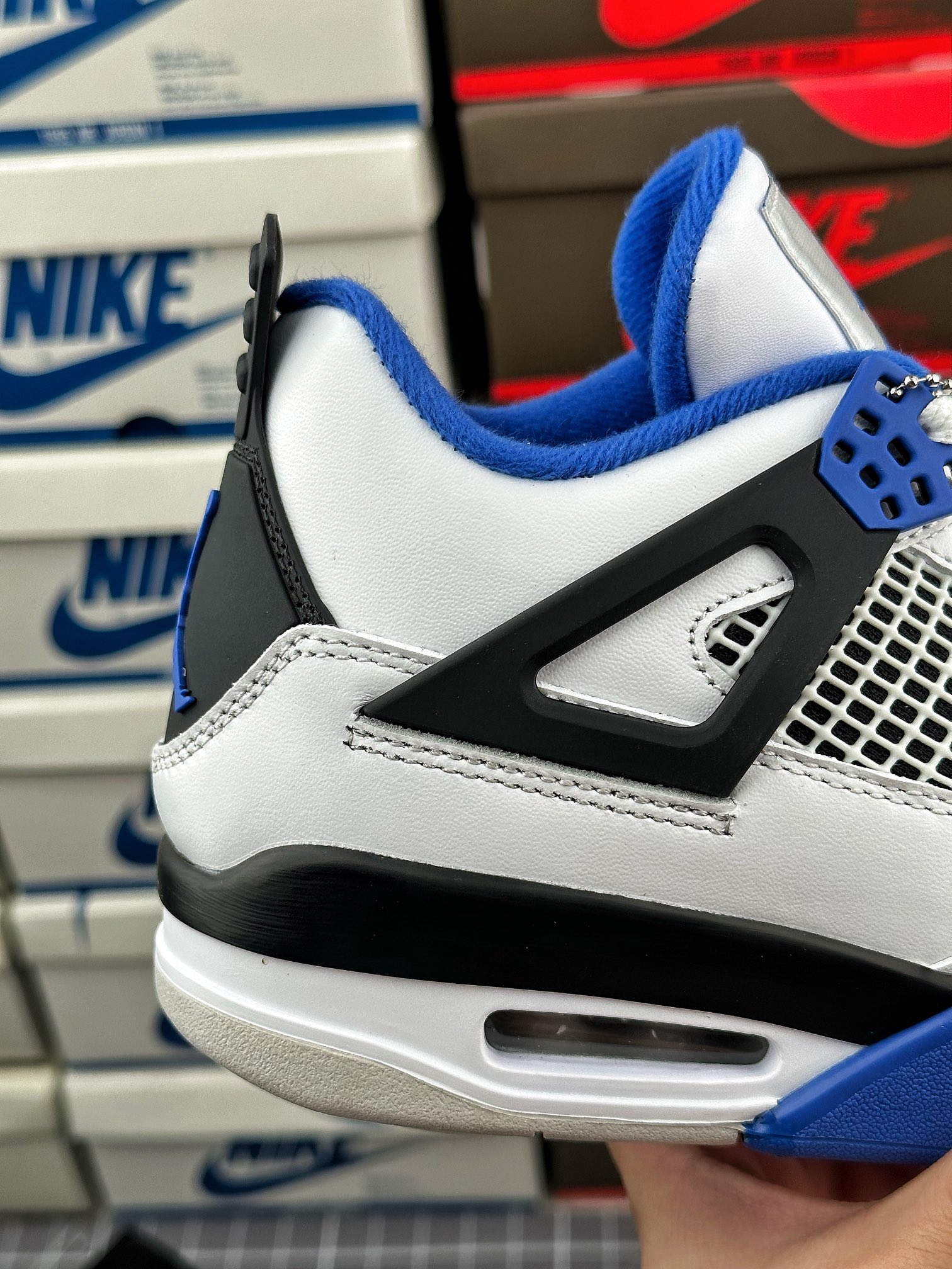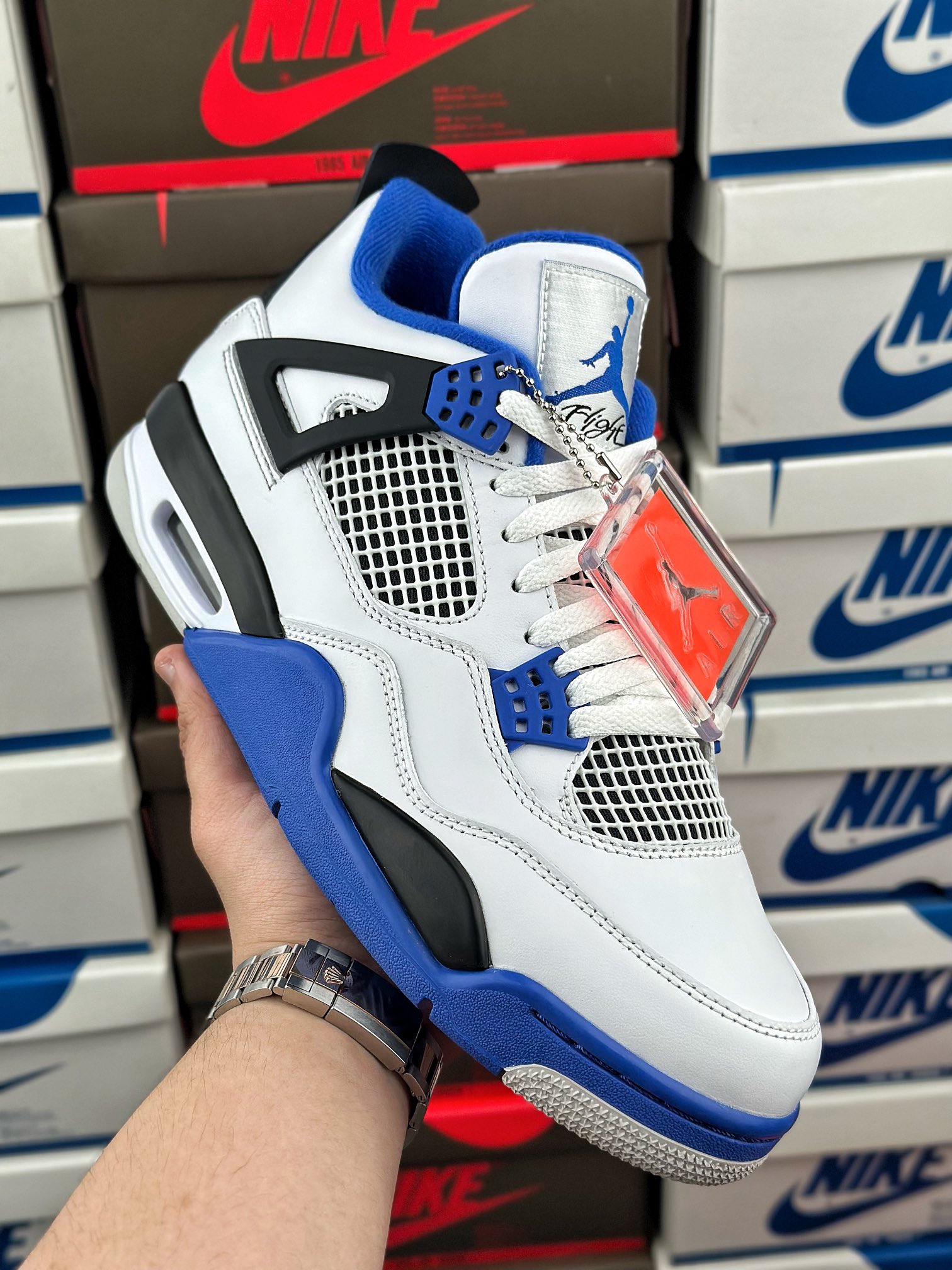 tento air jordan 4 byl inspirován barvou fnf z roku 2006, která byla vyrobena k výročí týmu mj’s motorsports racing. vyznačuje se kombinací černé, královské modré a bílé barvy.