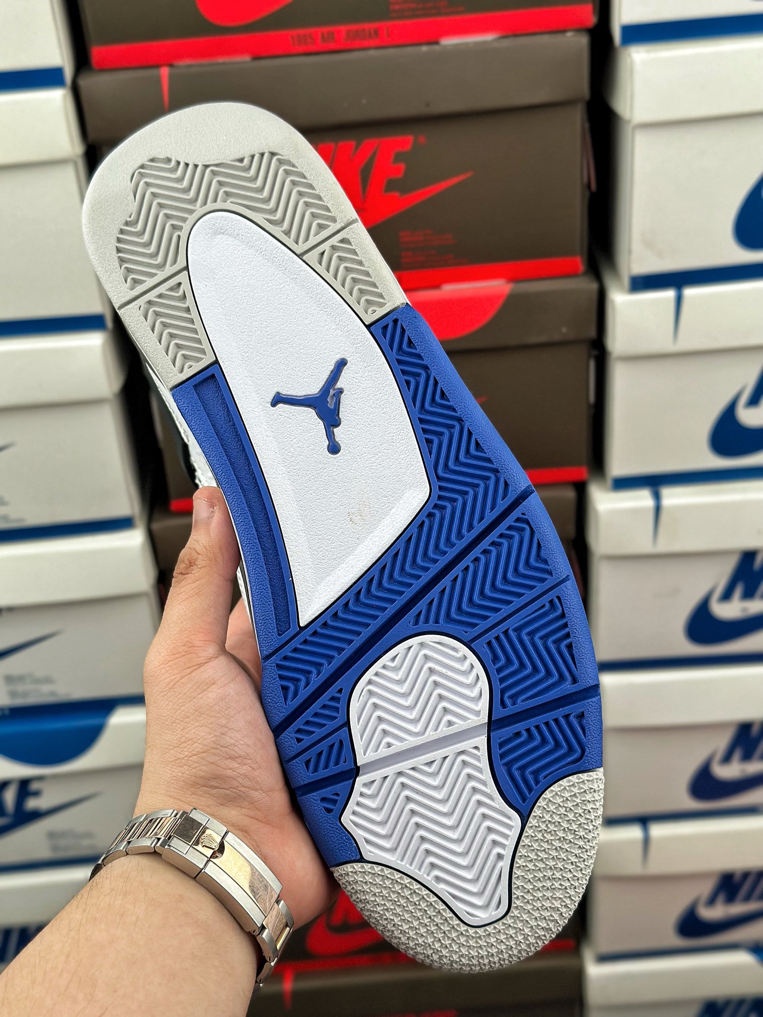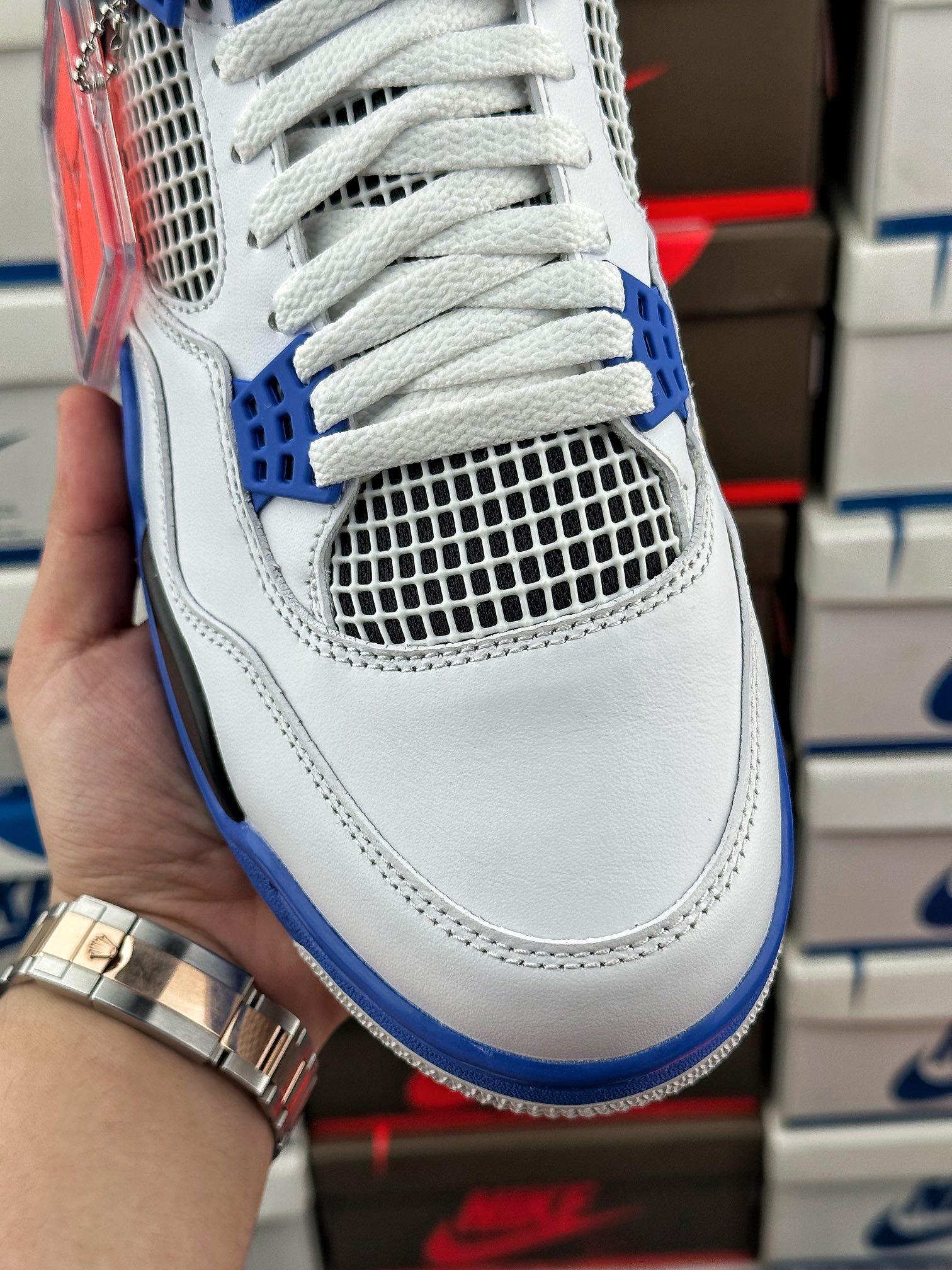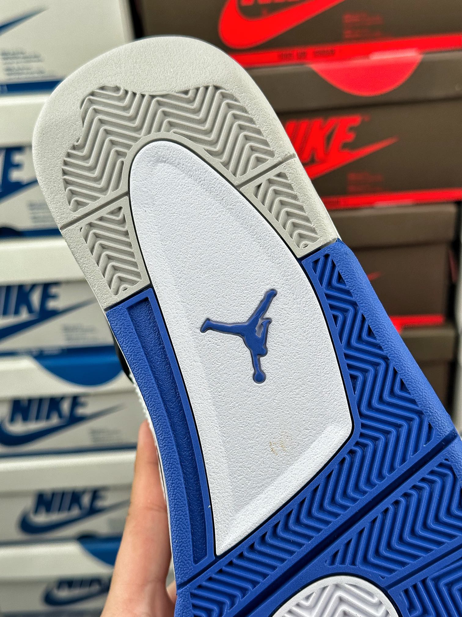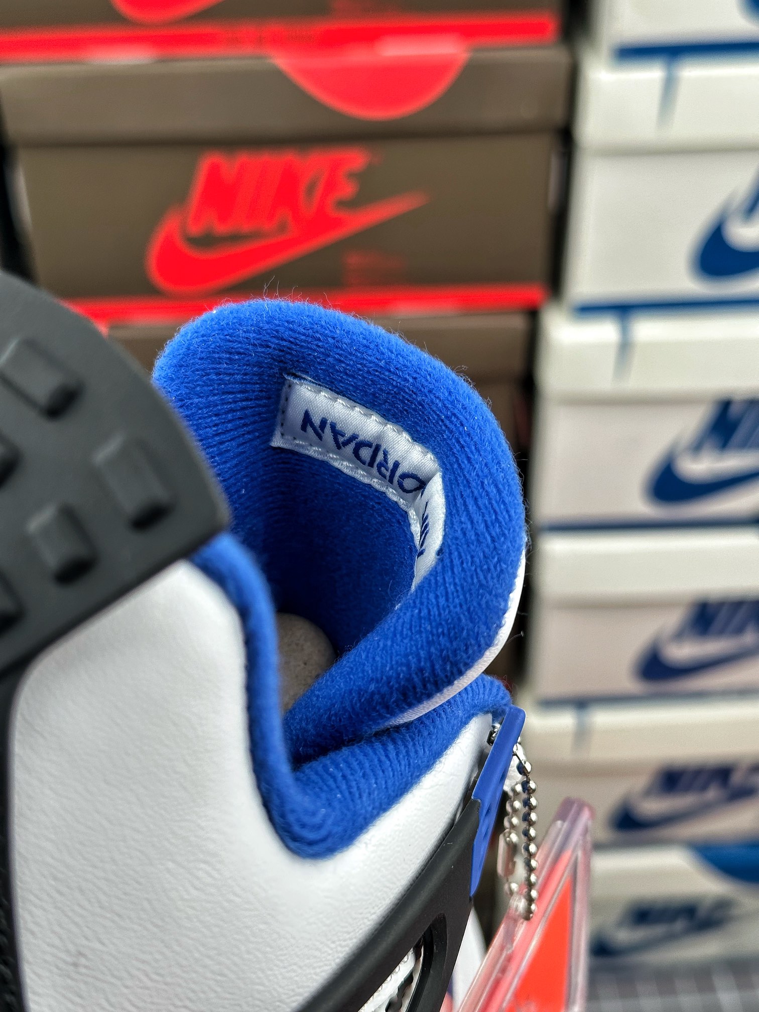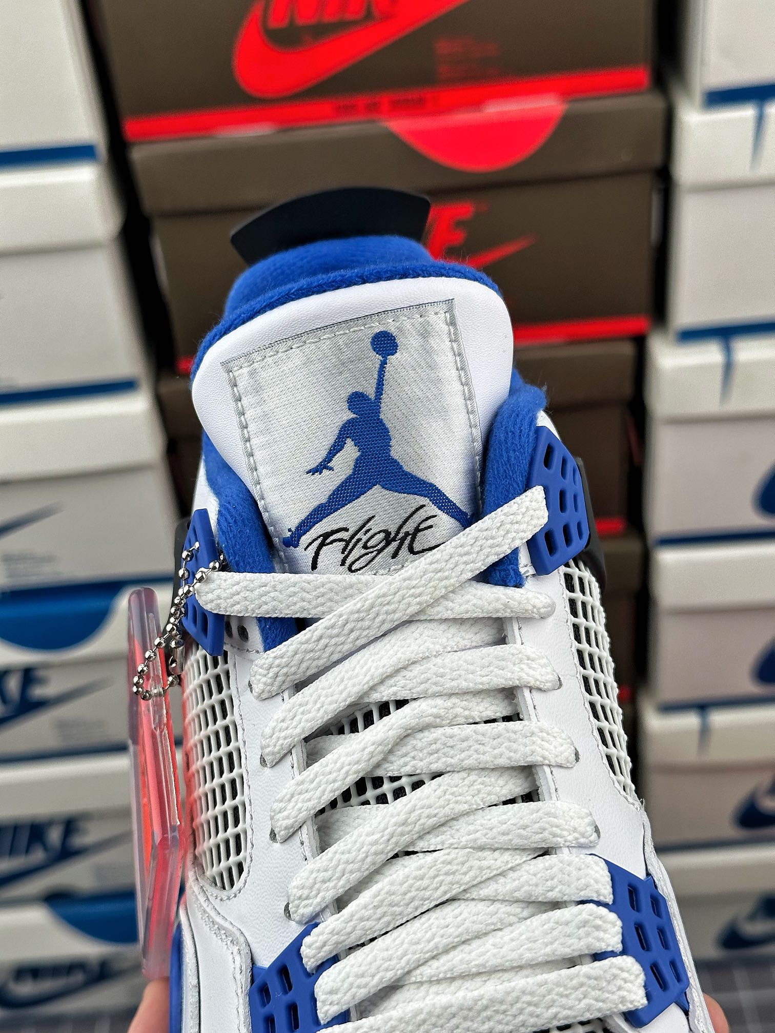 tento air jordan 4 byl inspirován barvou fnf z roku 2006, která byla vyrobena k výročí týmu mj’s motorsports racing. vyznačuje se kombinací černé, královské modré a bílé barvy.