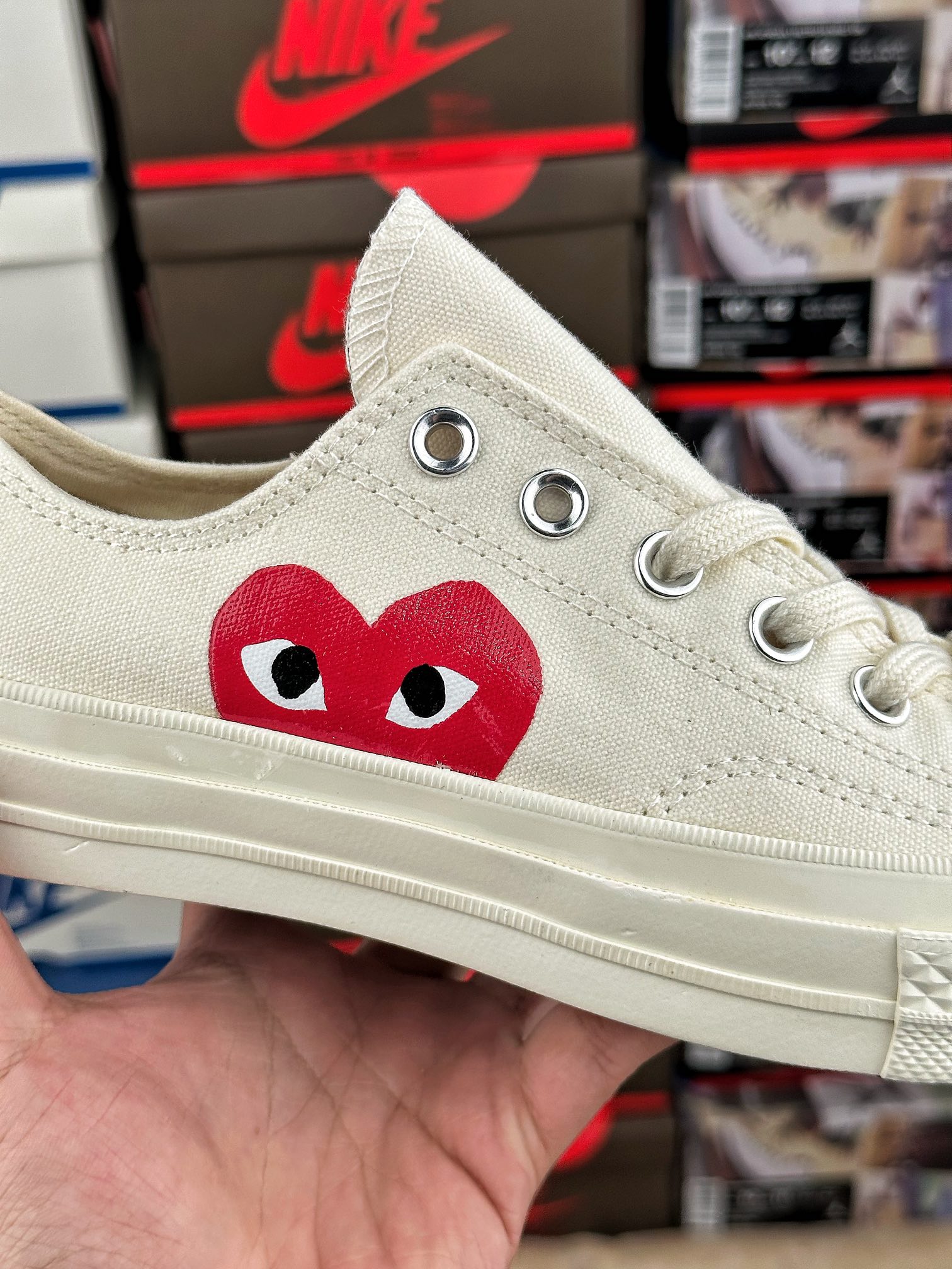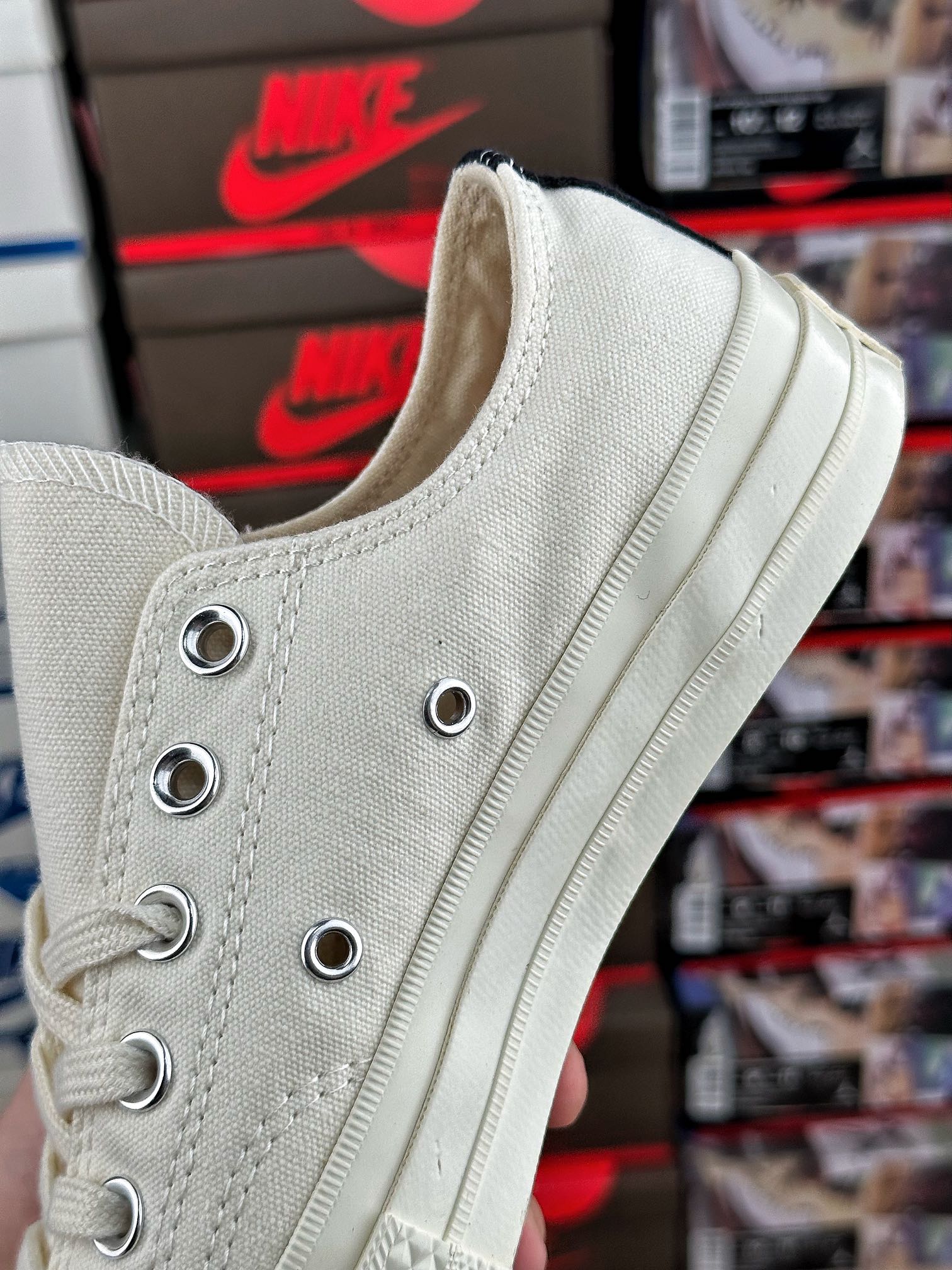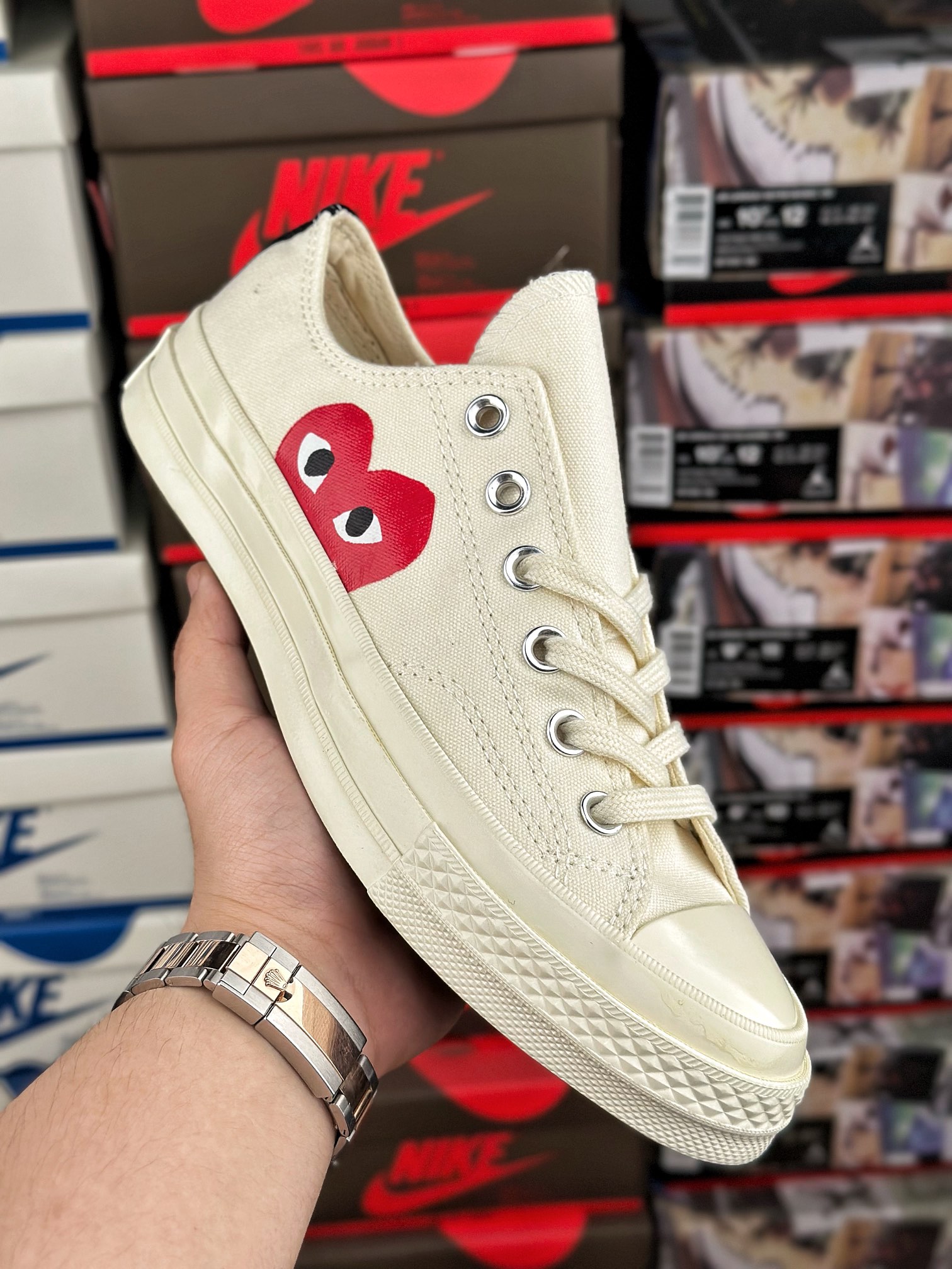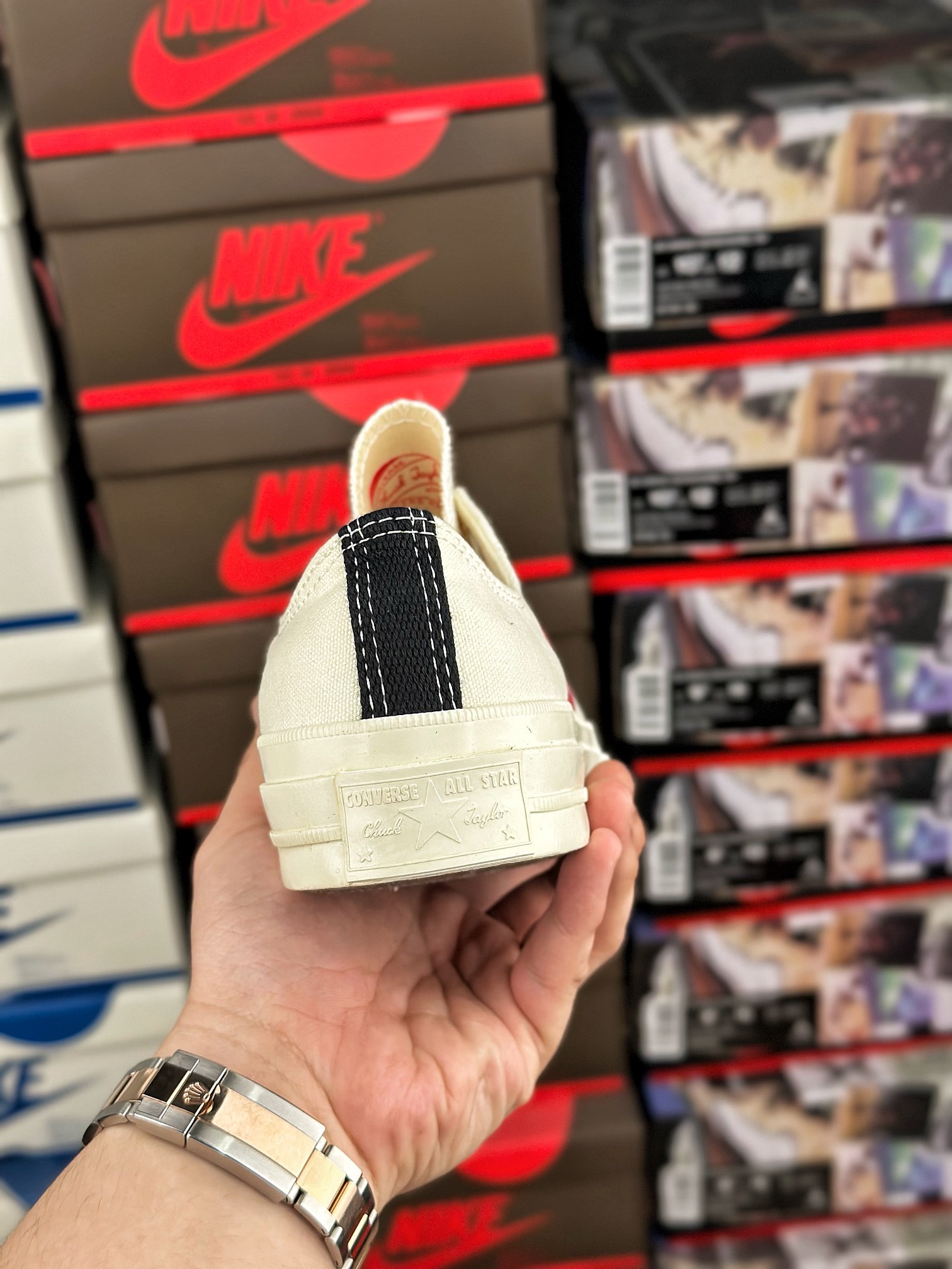 Converse Chuck Taylor All Star 70s Ox Comme des Garcons PLAY Black je model ikonické spolupráce mezi Comme des Garcons, japonskou značkou, a Converse. Model Converse Chuck Taylor All Star 70s Ox Comme des Garcons PLAY Black nabízí canvovou horní část. Také obsahuje kontrastní vzory šňůr a bílé švy. Na straně je červené srdce a silueta končící na smetanové podrážce. Converse Chuck Taylor All Star 70s Ox Comme des Garcons PLAY Black byl vydán v červenci 2017.