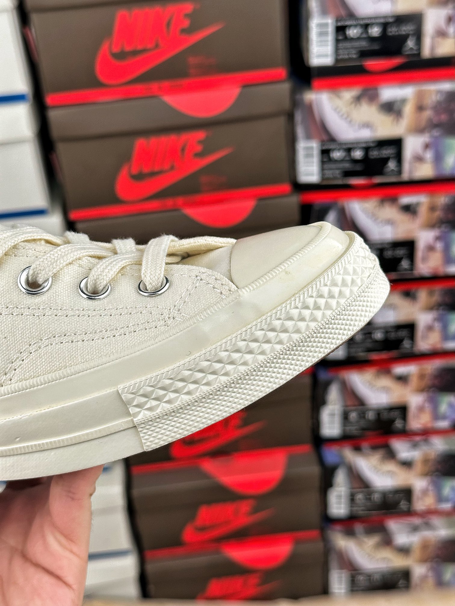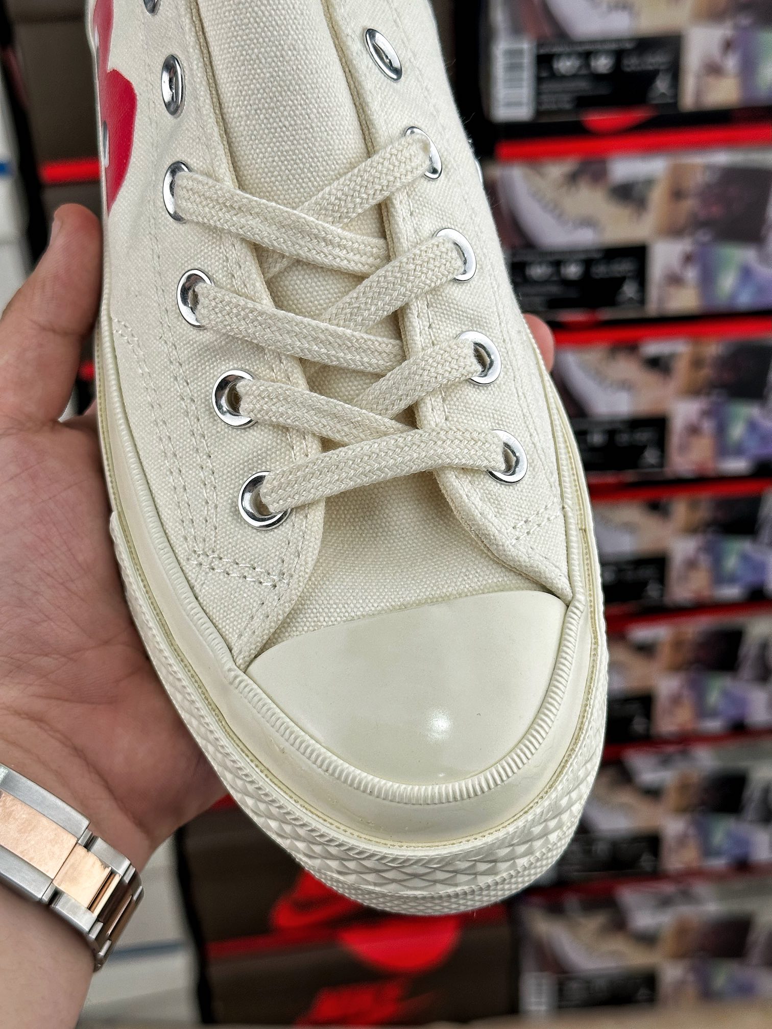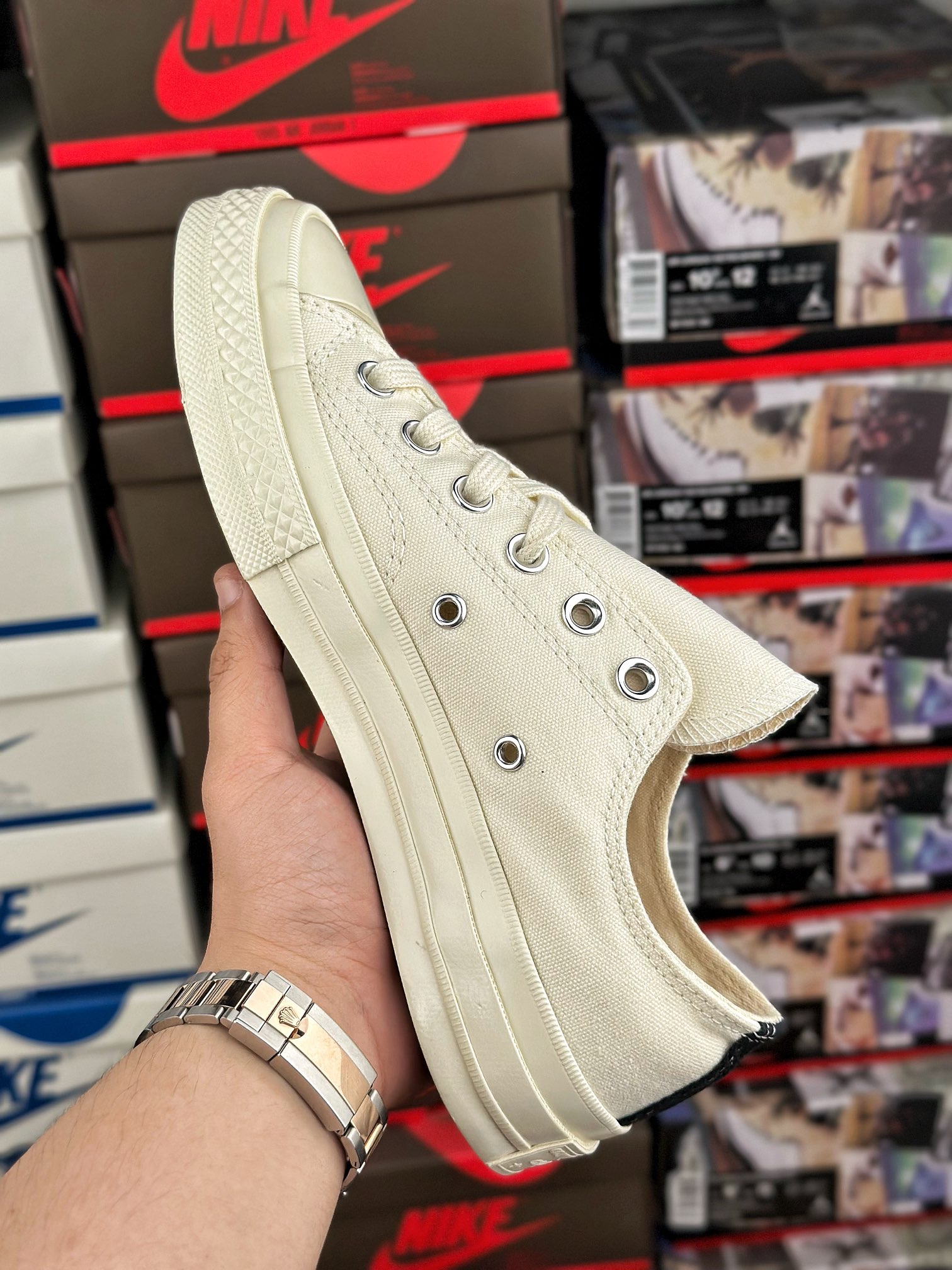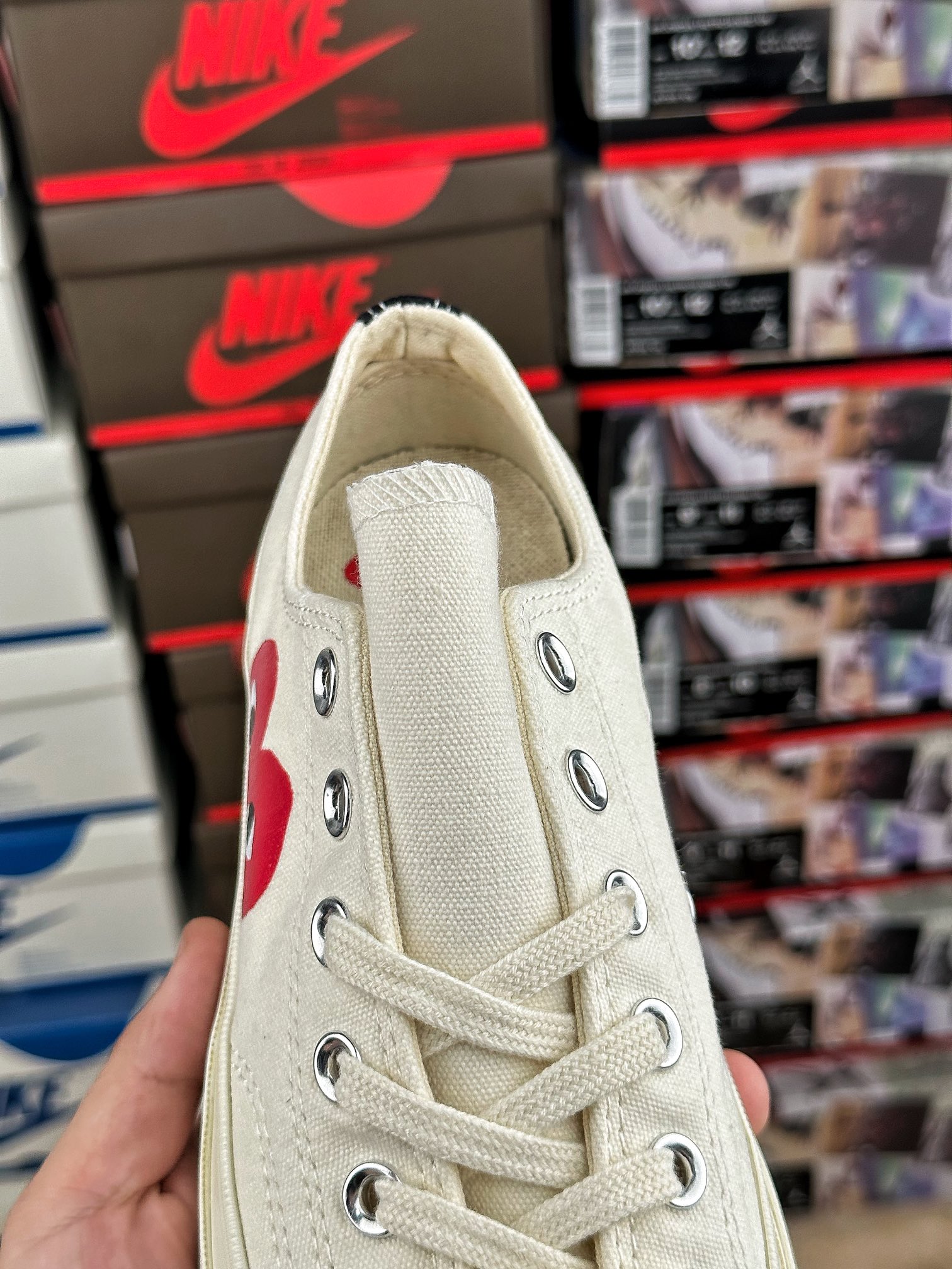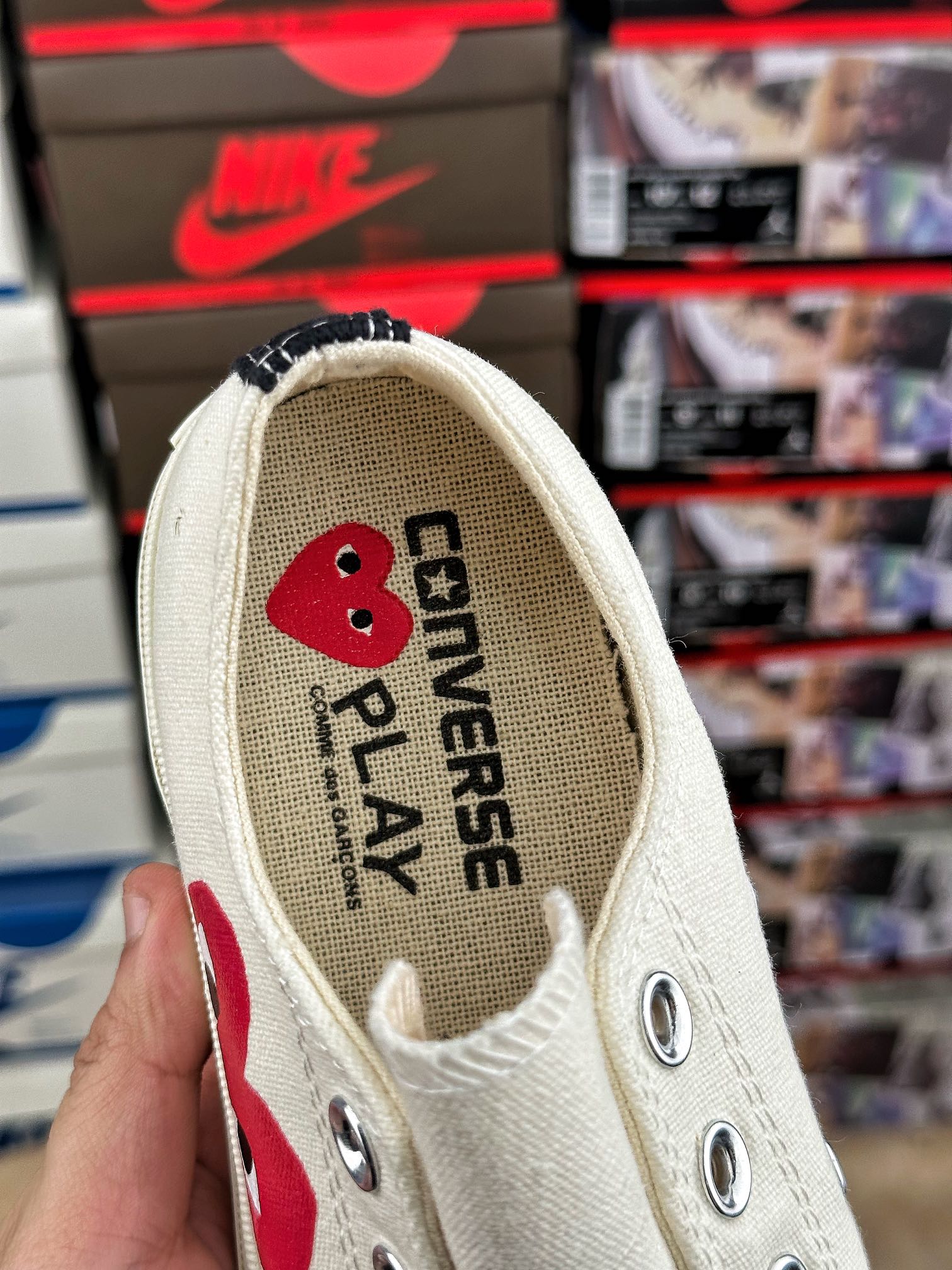 Converse Chuck Taylor All Star 70s Ox Comme des Garcons PLAY Black je model ikonické spolupráce mezi Comme des Garcons, japonskou značkou, a Converse. Model Converse Chuck Taylor All Star 70s Ox Comme des Garcons PLAY Black nabízí canvovou horní část. Také obsahuje kontrastní vzory šňůr a bílé švy. Na straně je červené srdce a silueta končící na smetanové podrážce. Converse Chuck Taylor All Star 70s Ox Comme des Garcons PLAY Black byl vydán v červenci 2017.