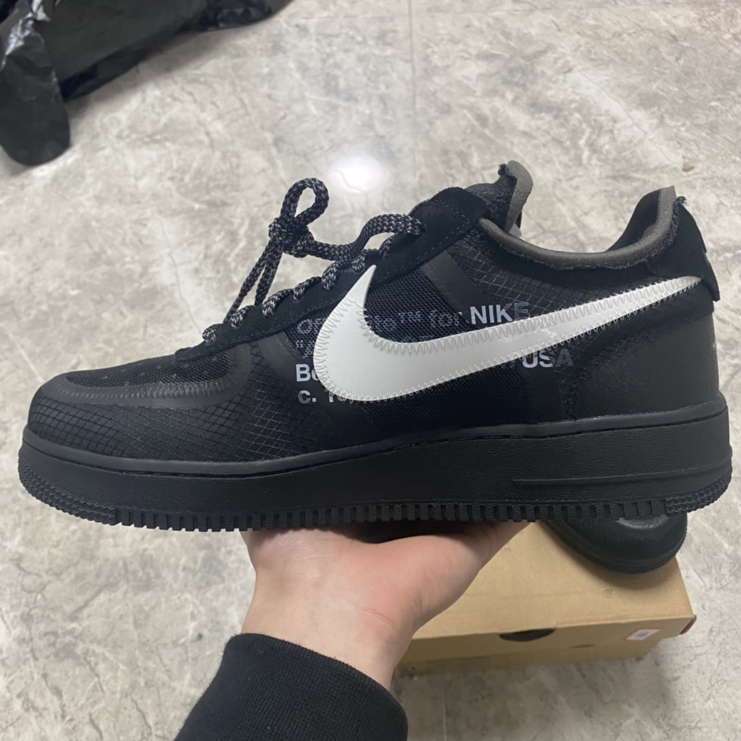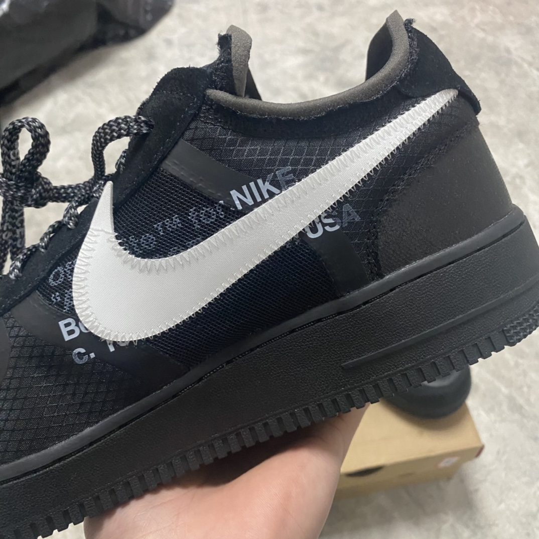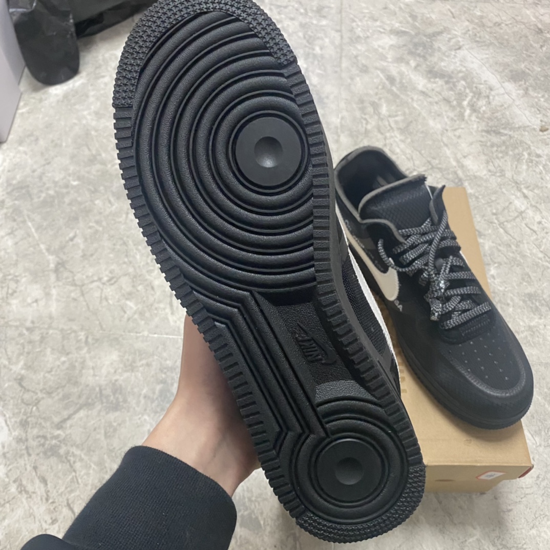 Tyto společné tenisky Nike Air Force 1 Low x Off-White™ x Black se vyznačují kombinací konvenčních aspektů a dekonstruovaných designových detailů, aby vytvořily AF1 s klasickým vzhledem, který má také svůj osobitý charakter. Podešev, která je celá v černé barvě, má tradiční konstrukci jako otočné kruhové úchopové linie probíhají v kruzích kolem dvou centrálních disků v patě a přední části chodidla, aby nositeli dodali jistotu při pohybu. To je spojeno se zapouzdřeným Air v patě, což je zvýrazněno jak reliéfním písmem na boční mezipodešvi, tak výrazným textem Air, který se vyjímá v bílé barvě těsně nad ním.