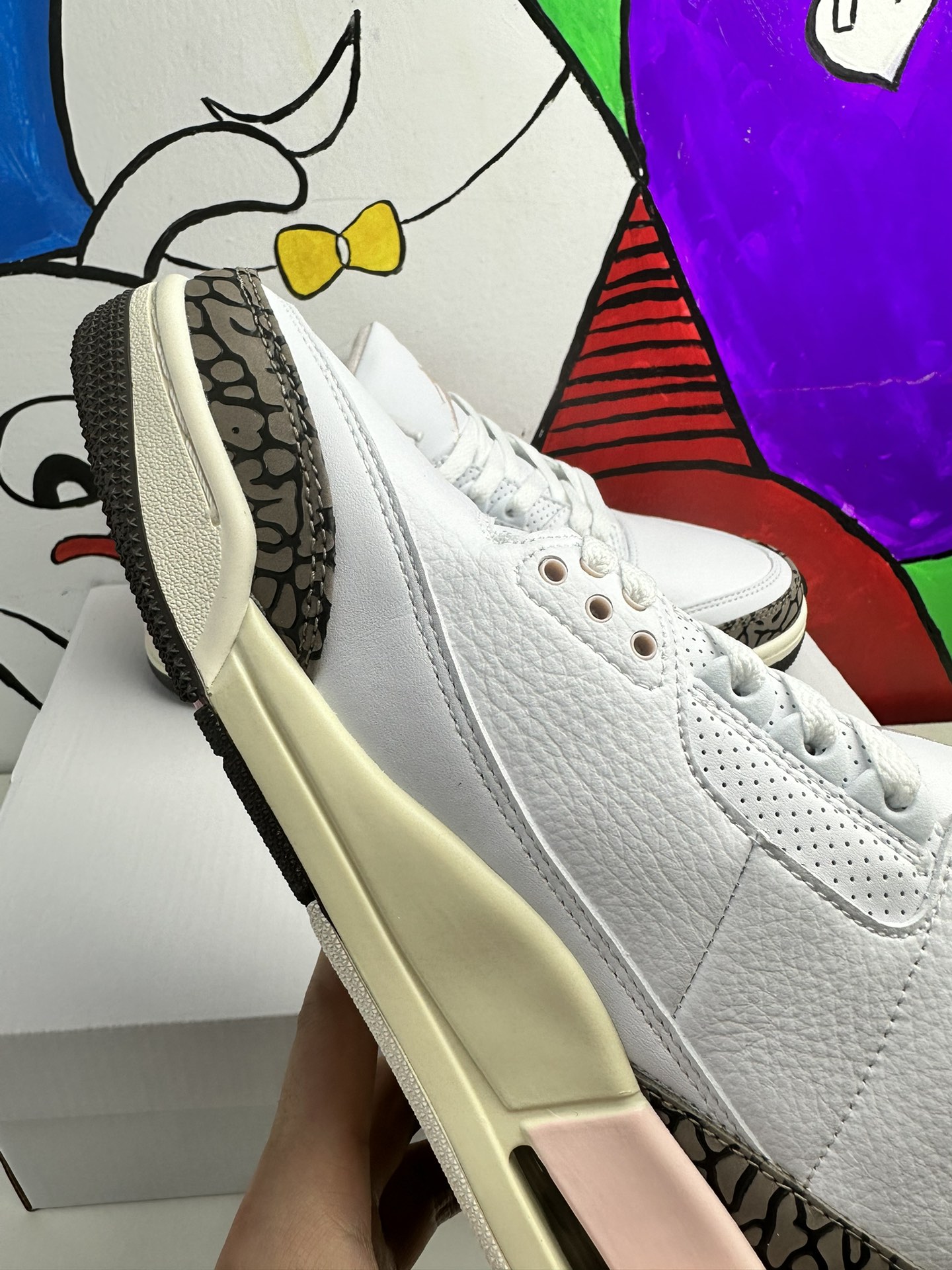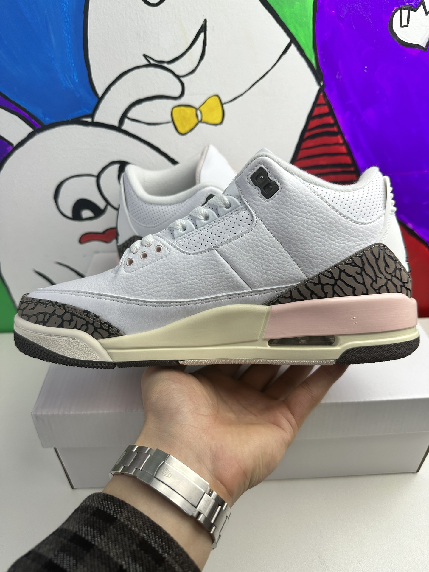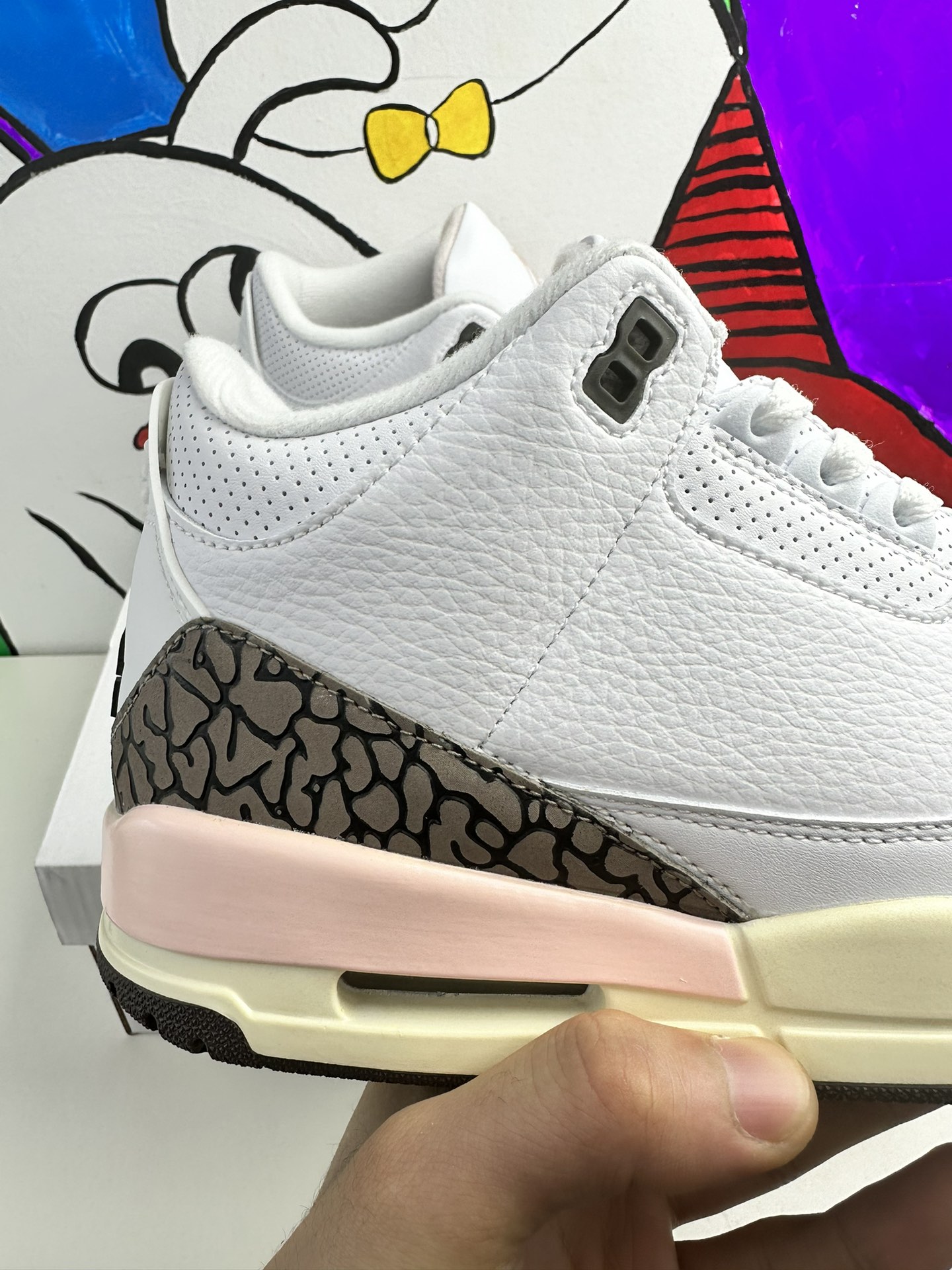 Kotníkové tenisky Air Jordan 3 Retro Neapolitan Dark Mocha mají na svém svršku kombinaci bílé, růžové a hnědé barvy. Zvláštnosti je vzor s motivem slonoviny použitý na některých částech tenisky.
