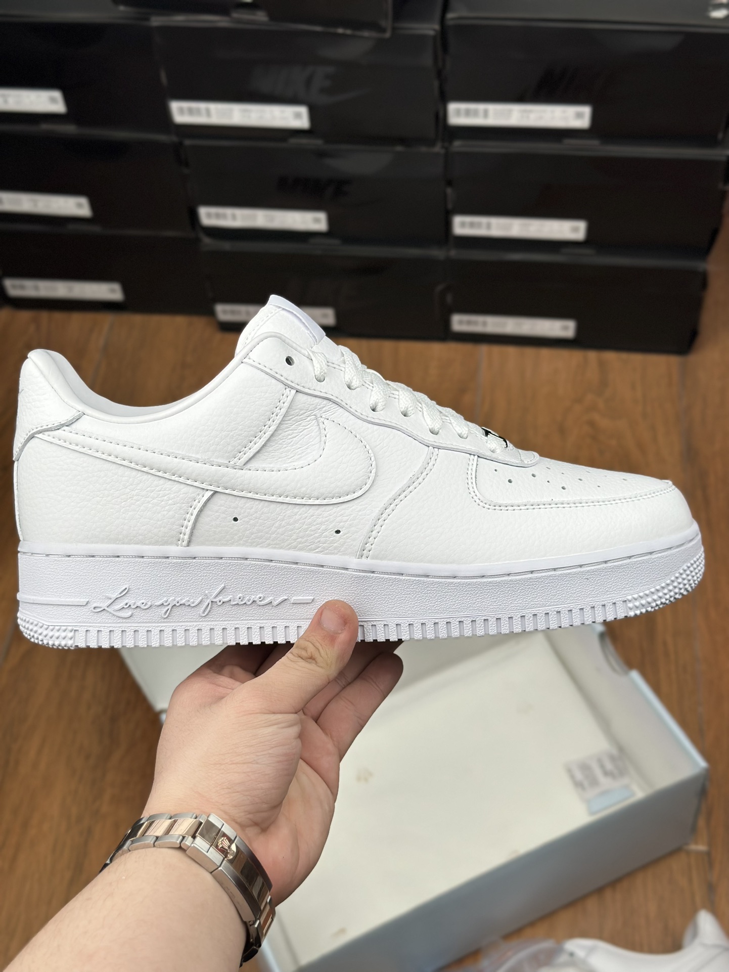Klasické nízké tenisky Nike Air Force 1 Low jsou legendou a nemohou chybět v botníku každého nadšence sneakers. Tenisky Nike Air Force 1 Low Drake NOCTA Certified Lover Boy mají místo klasických hvězdiček na podrážce malá srdíčka a na patě logo značky Nocta místo typického Air nápisu na straně s textem „Love you forever“.