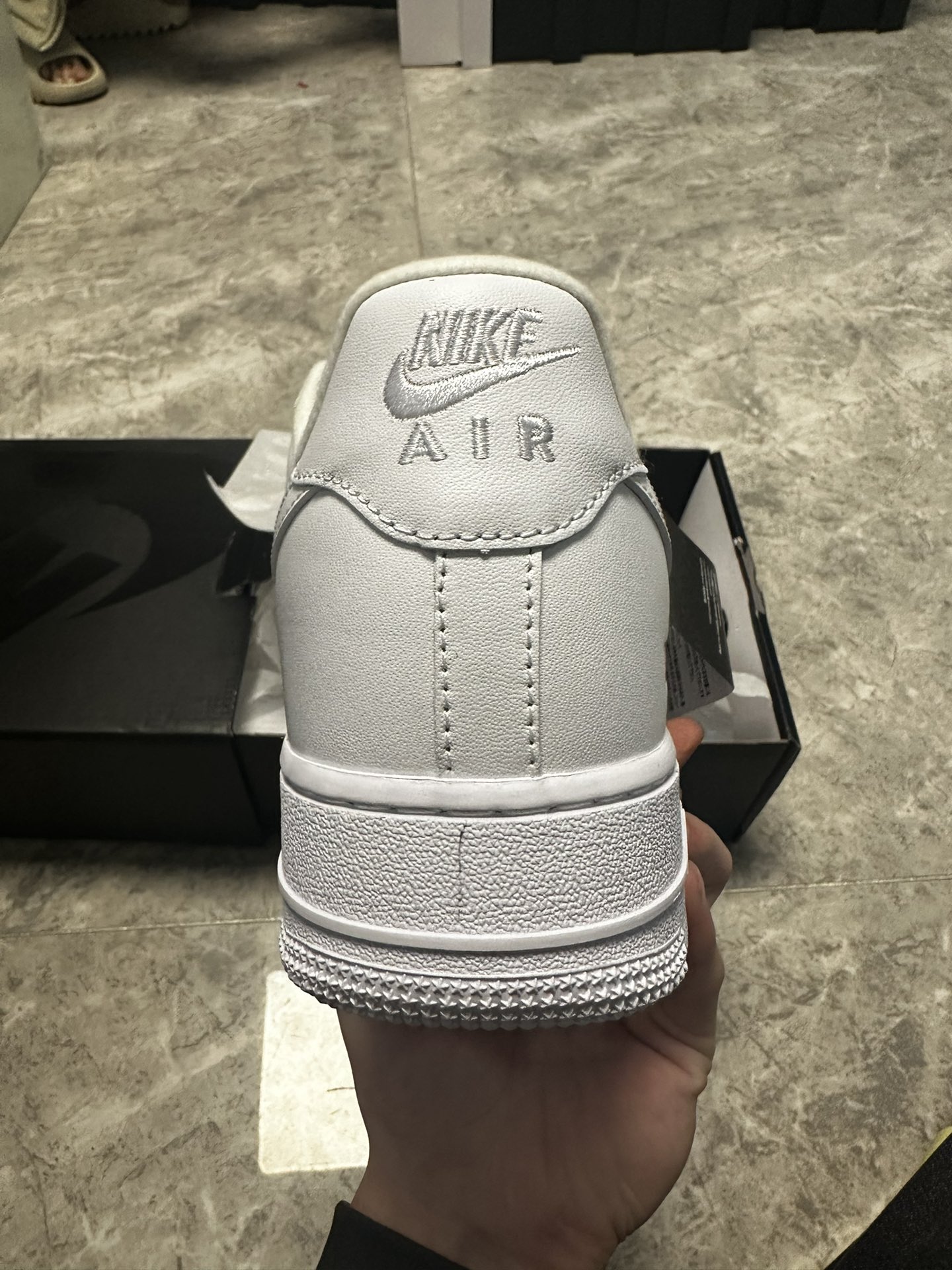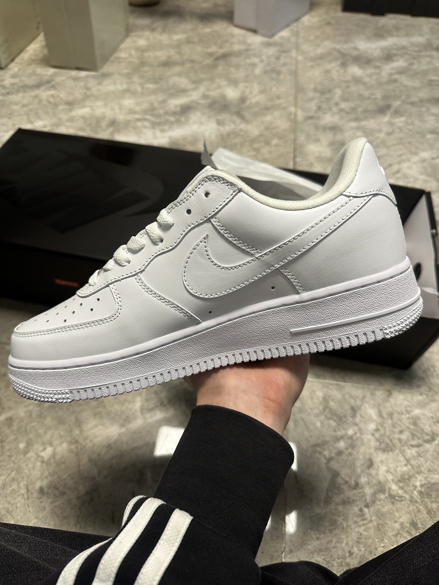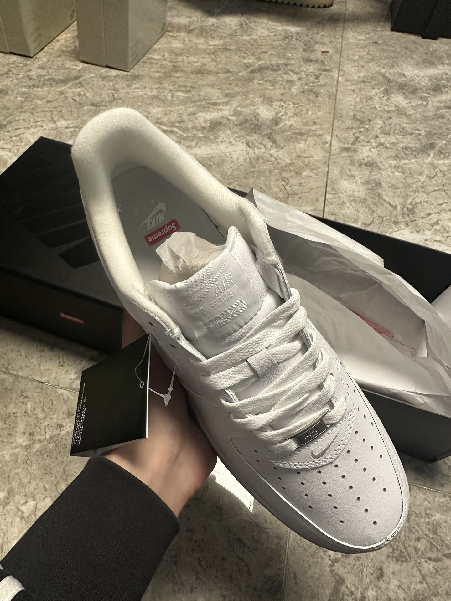 Bílé tenisky Nike Air Force 1, které nikdy neomrzí. Tento ikonický kousek spolupracuje se značkou Supreme, která umístí své malé boxlogo na zadní část tenisek.