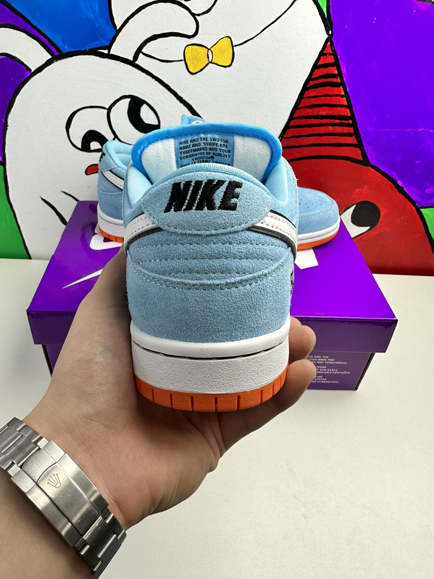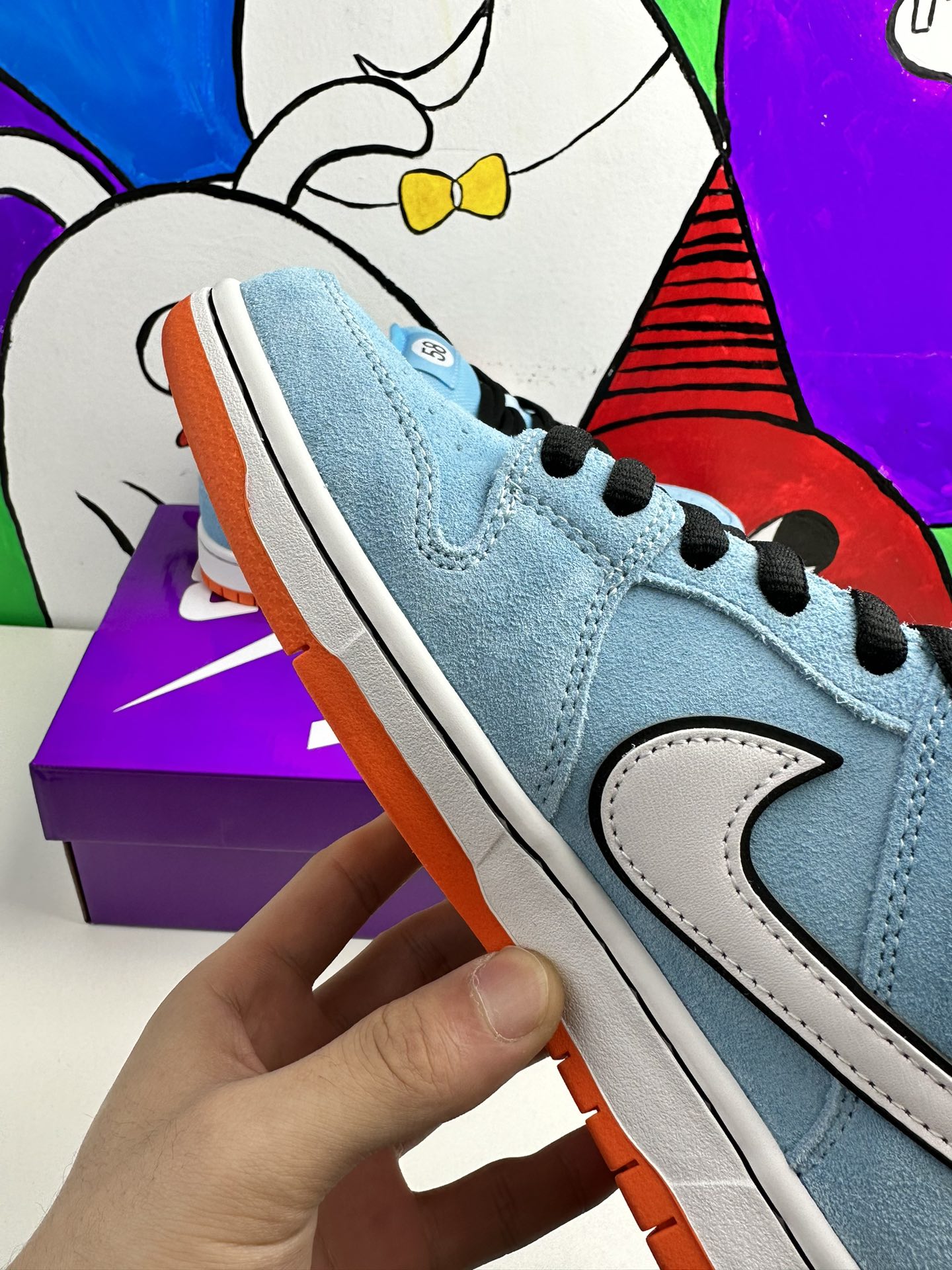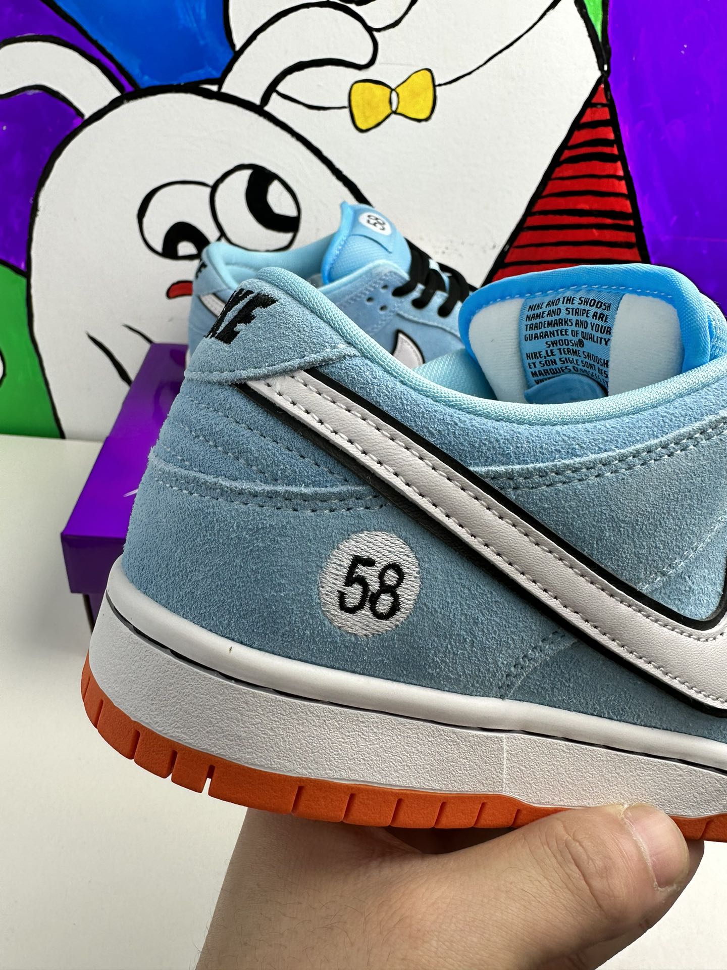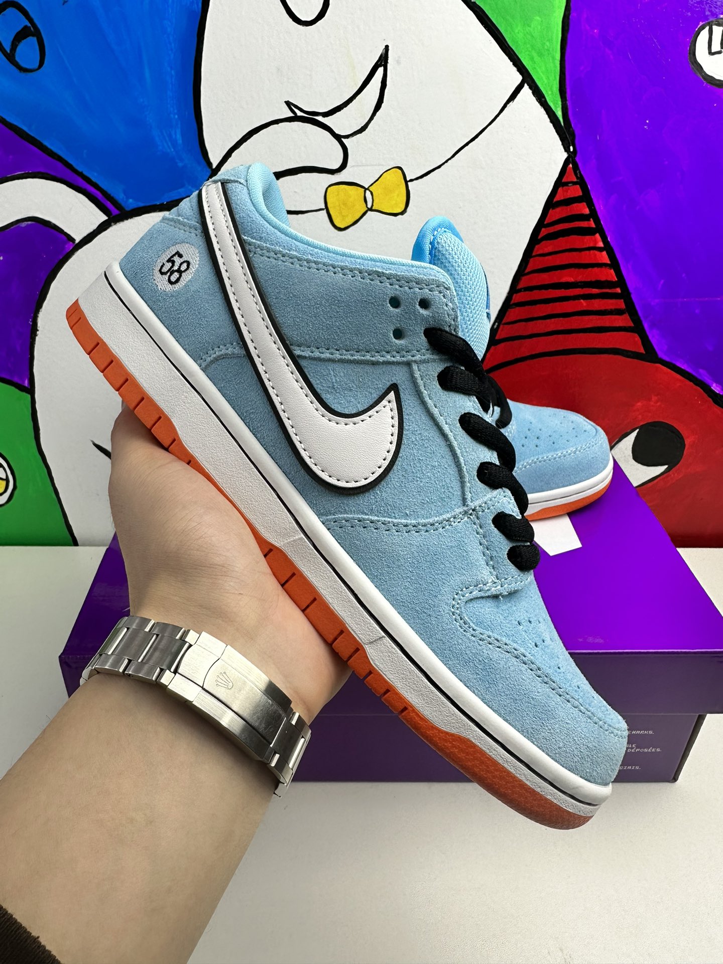 Nike Dunk Low Pro SB ‚Gulf‘ navazuje na Blazer Mid ‚Club 58‘ z roku 2018, přičemž oba jsou navrženy ve spolupráci s konsorciem čtyř předních skate shopů se sídlem v západní Evropě. Světle modrý semiš je použit v celém svršku, zvýrazněn bílým koženým Swoosh a kruhovou grafikou 58 na boční patě. Číslice se opakují na tkaném štítku připevněném k vycpanému síťovému jazyku. Jasně oranžová gumová podrážka pod nohama dodává kontrastní barvu.