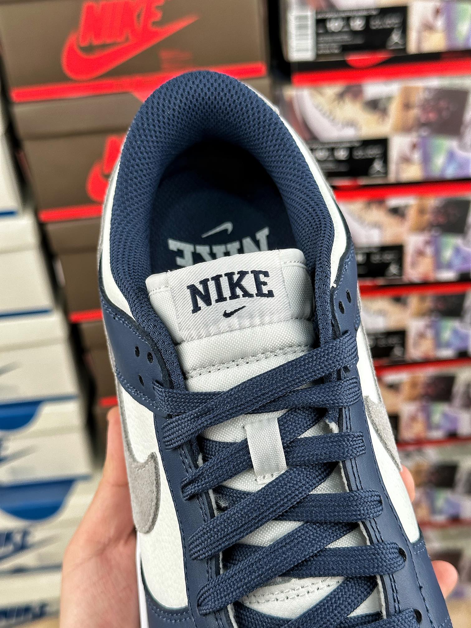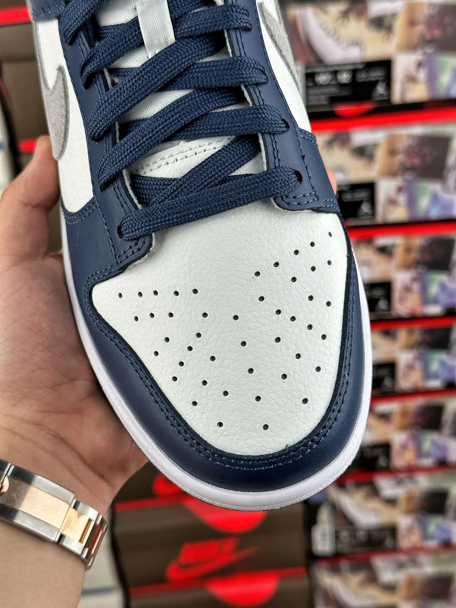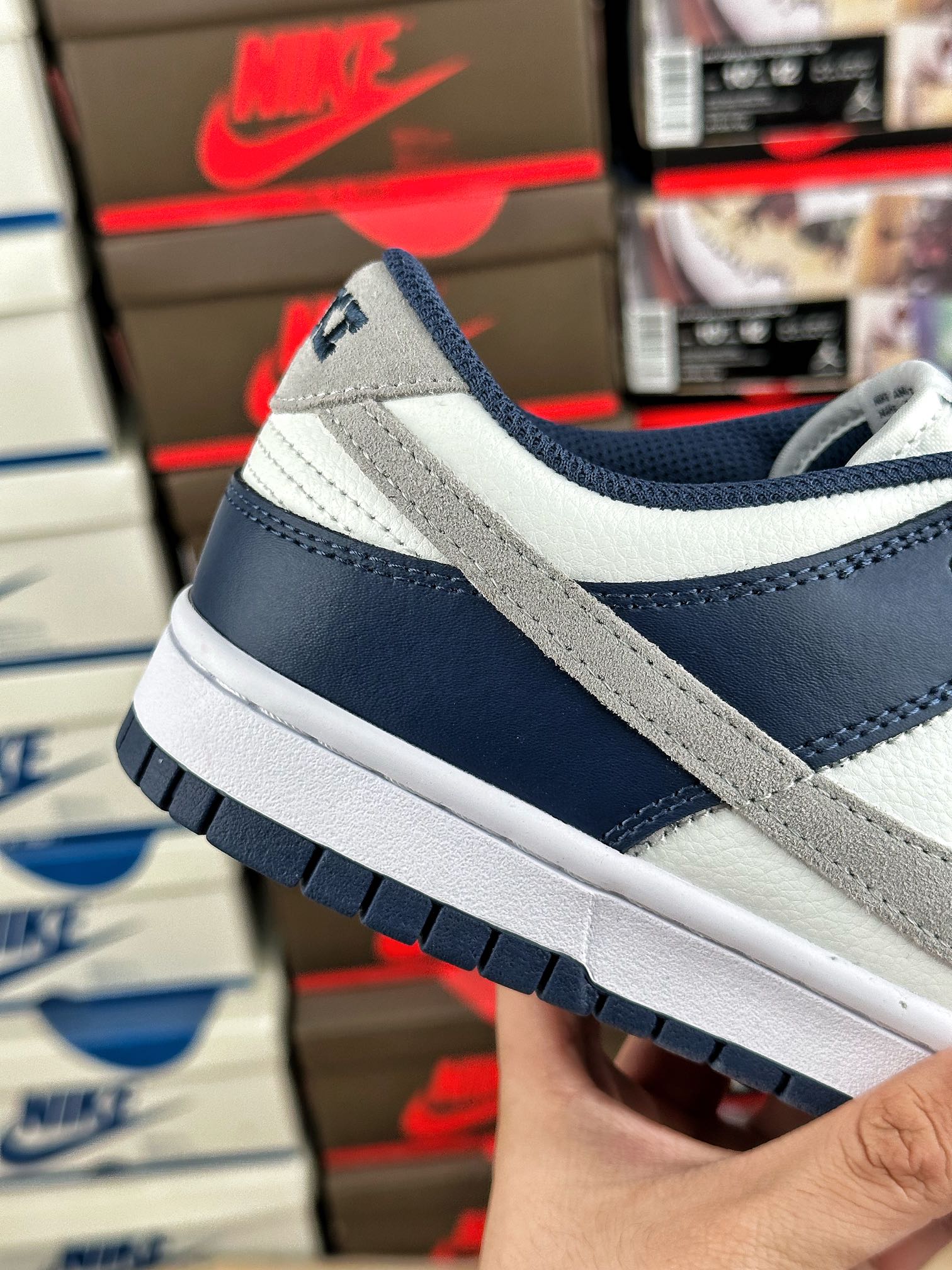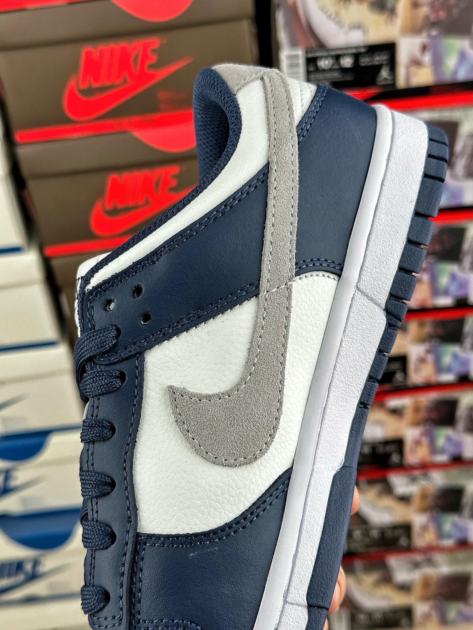 Tenisky Nike Dunk Low Summit White Midnight Navy mají na svém svršku v kombinaci modré, šedé a bílé barvy. Model Nike Dunk je v současné době jedním z nejoblíbenějších typů tenisek mezi sběrateli a vydává se v limitovaném množství.