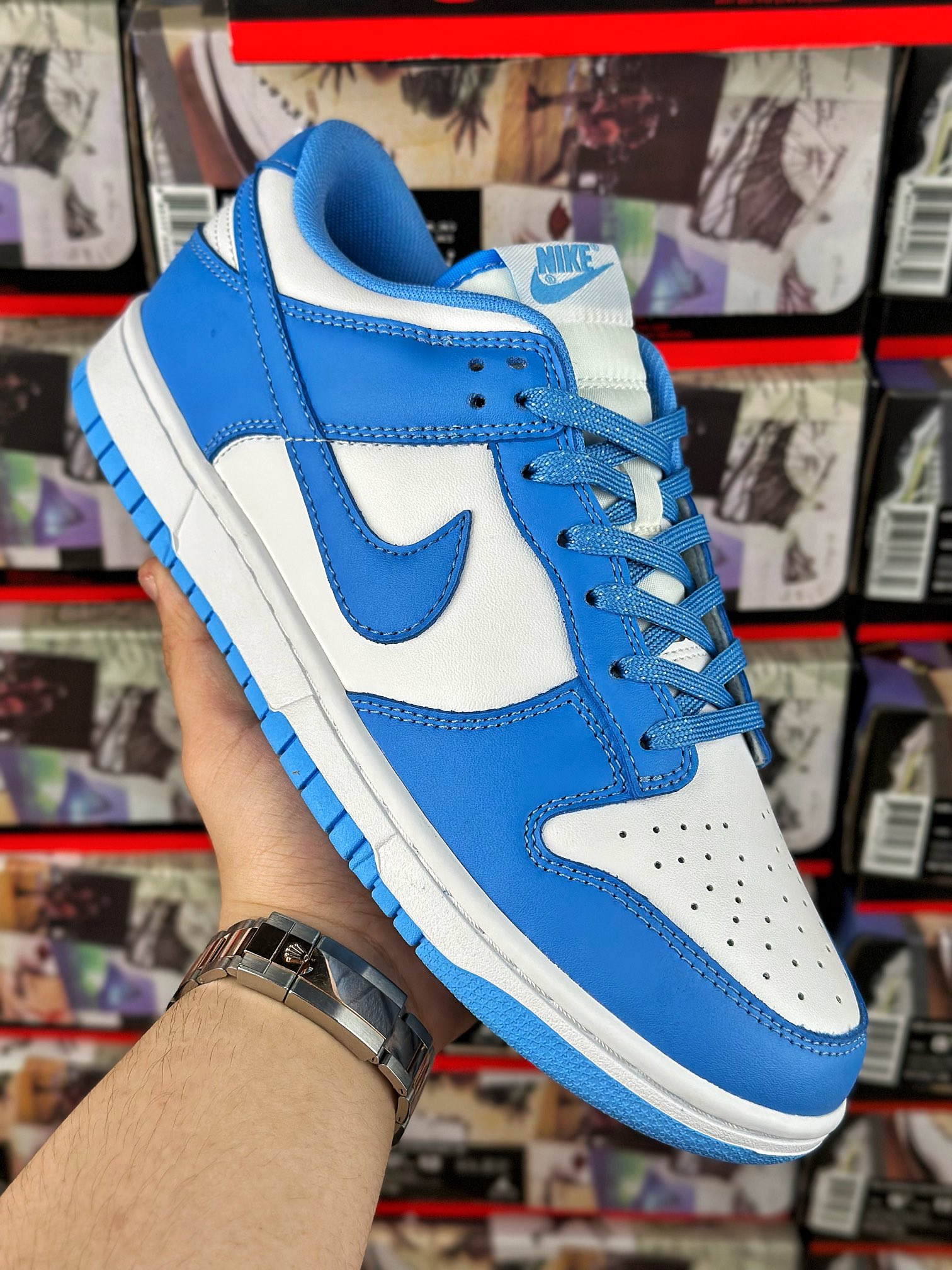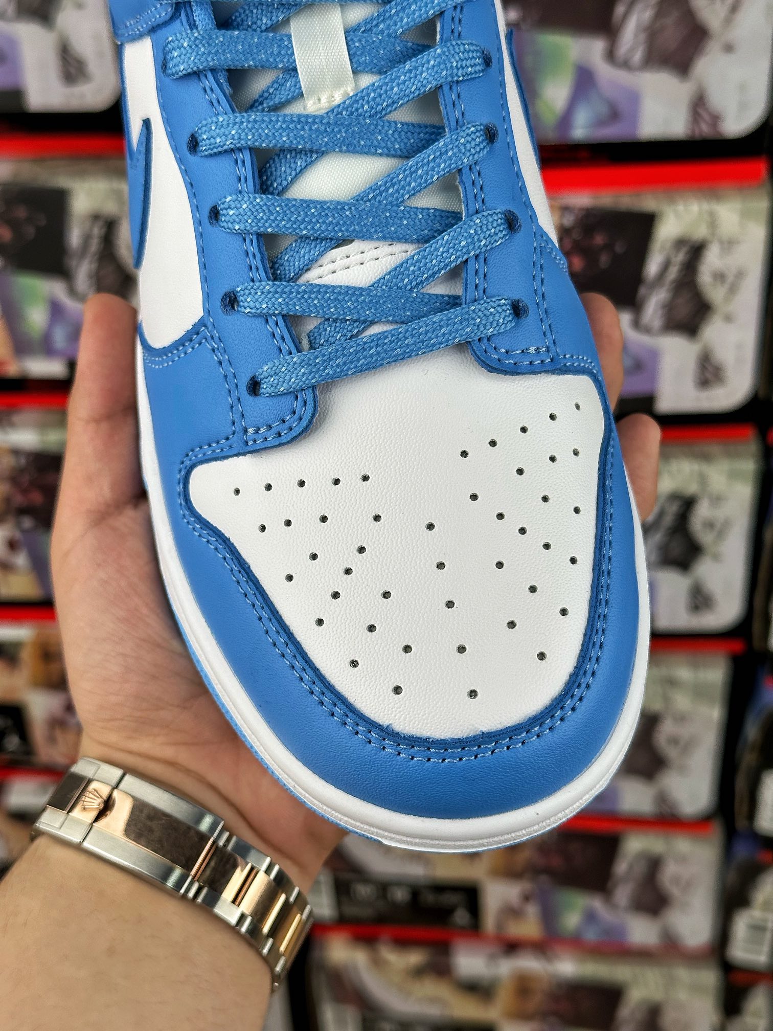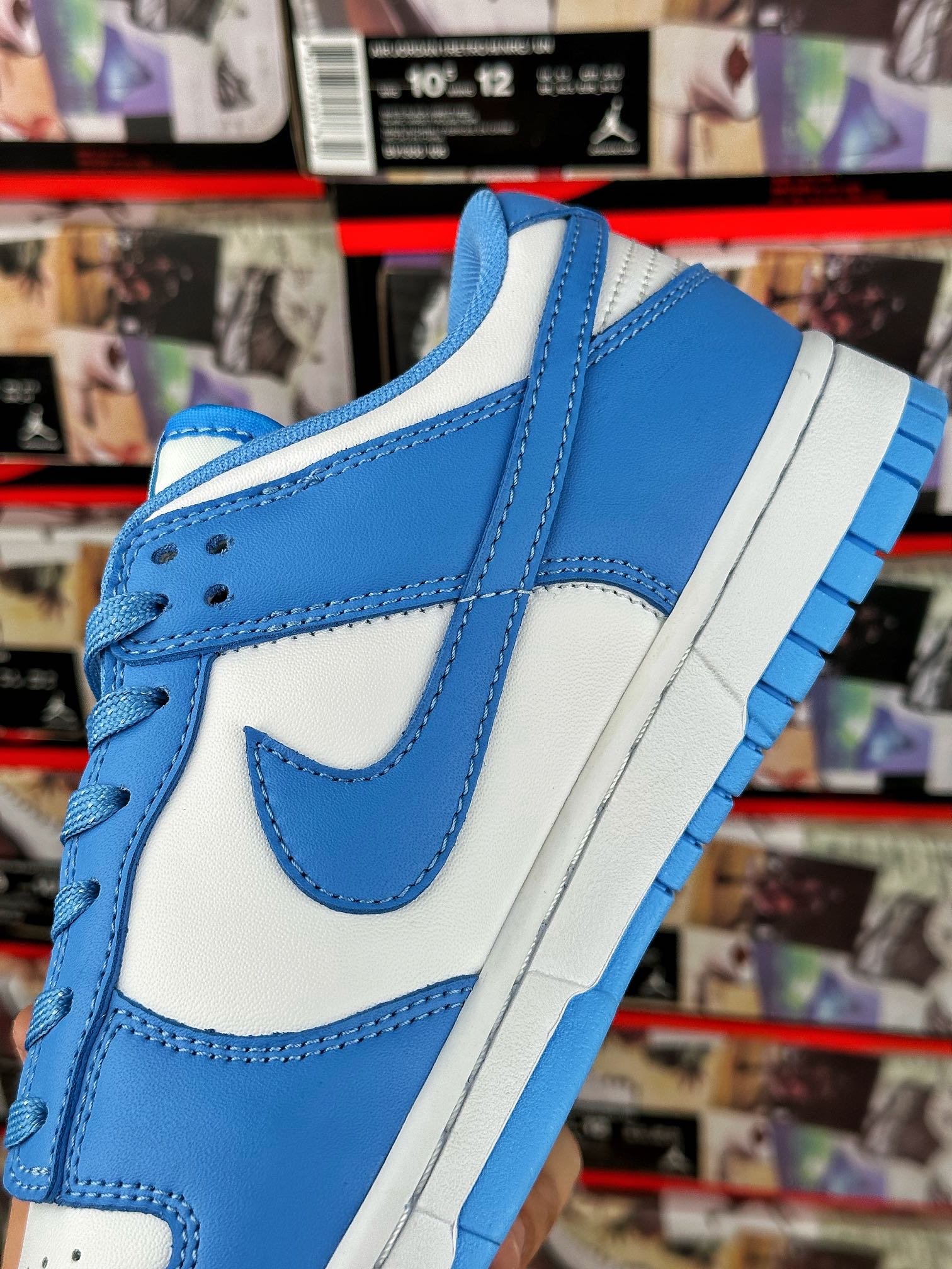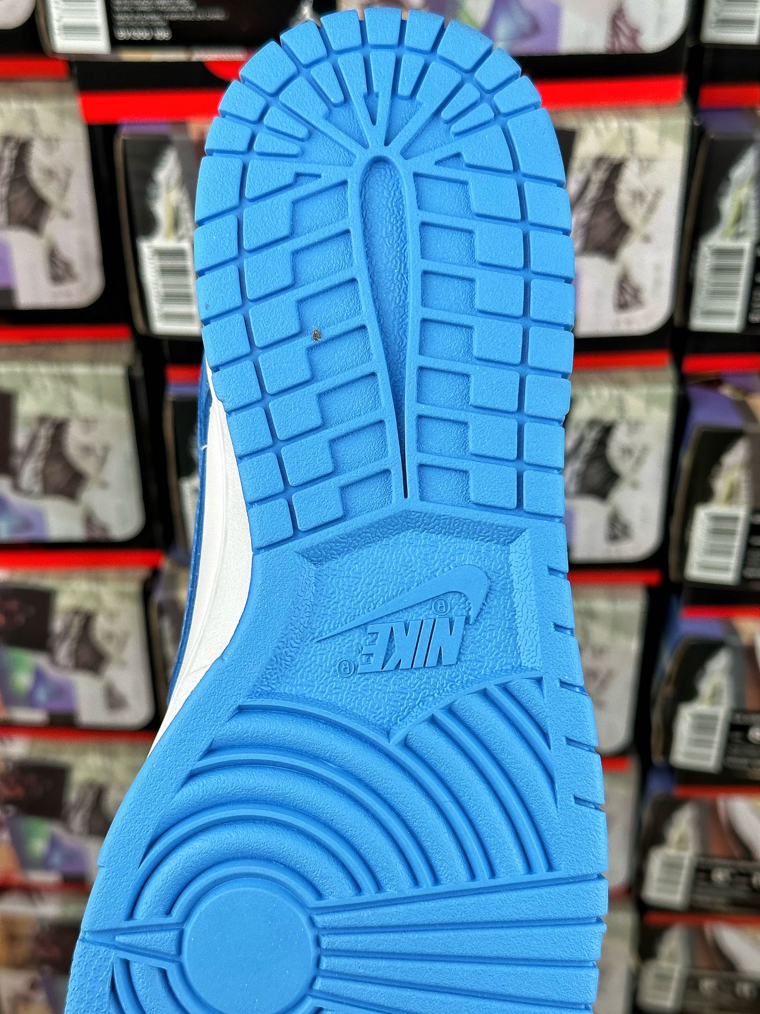 Tento pár Nike Dunk Lows má klasický dvoubarevný design, který mu dodává styl dědictví. Jeho retro vzhled začíná na gumové jednotce podrážky, která je rozdělena na bílou mezipodešev a univerzitní modrou podrážku. První z nich je opatřena pásem prošití, které probíhá v drážce po celém obvodu, zatímco druhá má sadu přilnavých vzorků, které uživateli nabízejí dobrou úroveň trakce a podpory. Patří mezi ně soustředné kruhy, které napomáhají otáčení přední části chodidla, a robustní výstupky pod patou. Pod klenbou chodidla je velká členitá část s nápisem „Nike“ a nápisem swoosh, který z ní vystupuje.