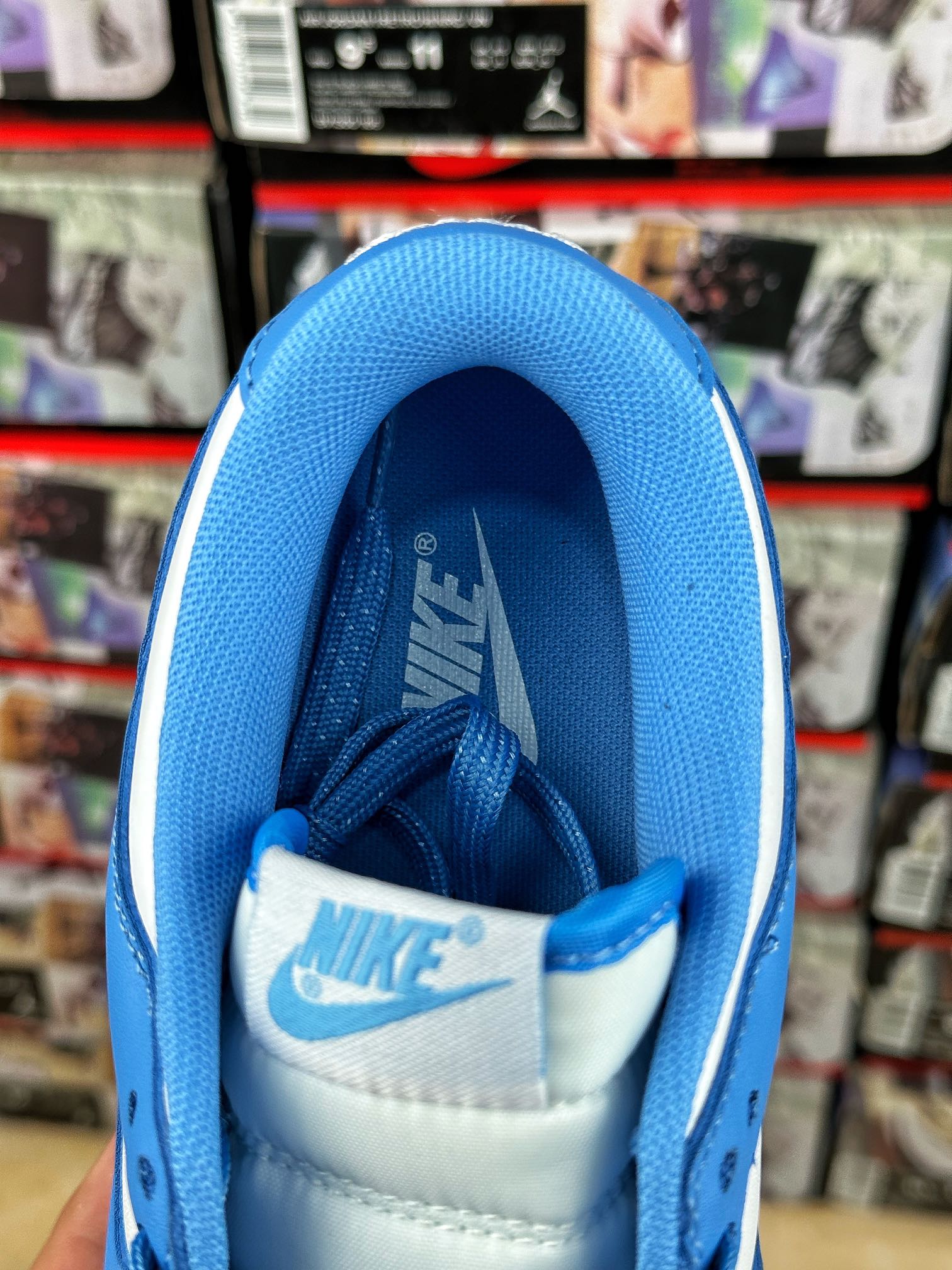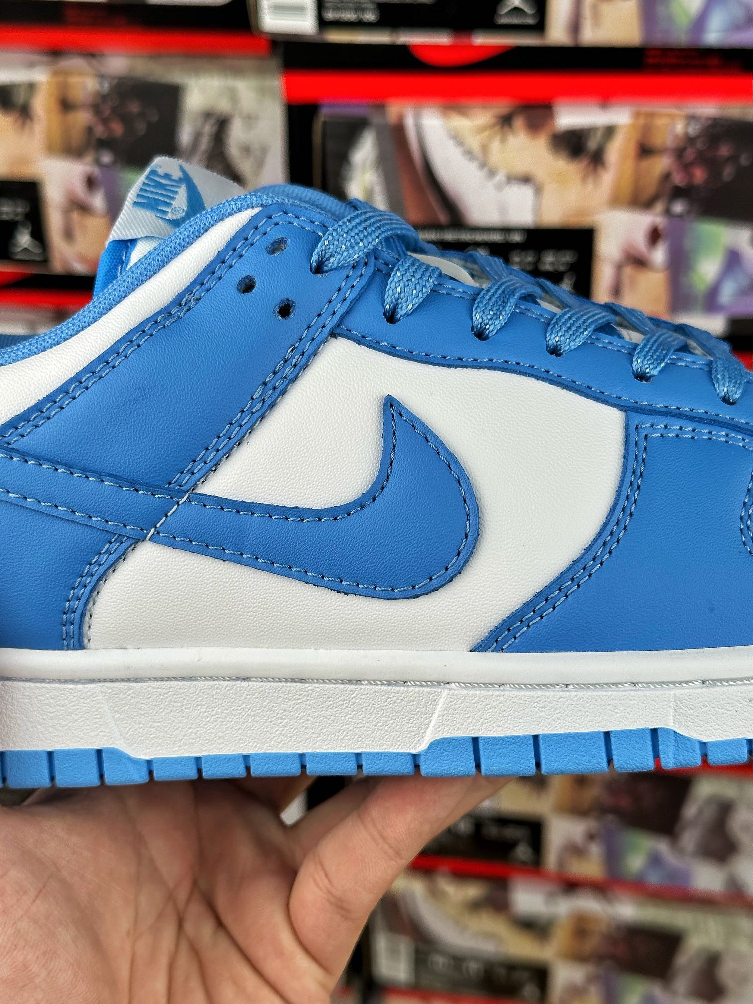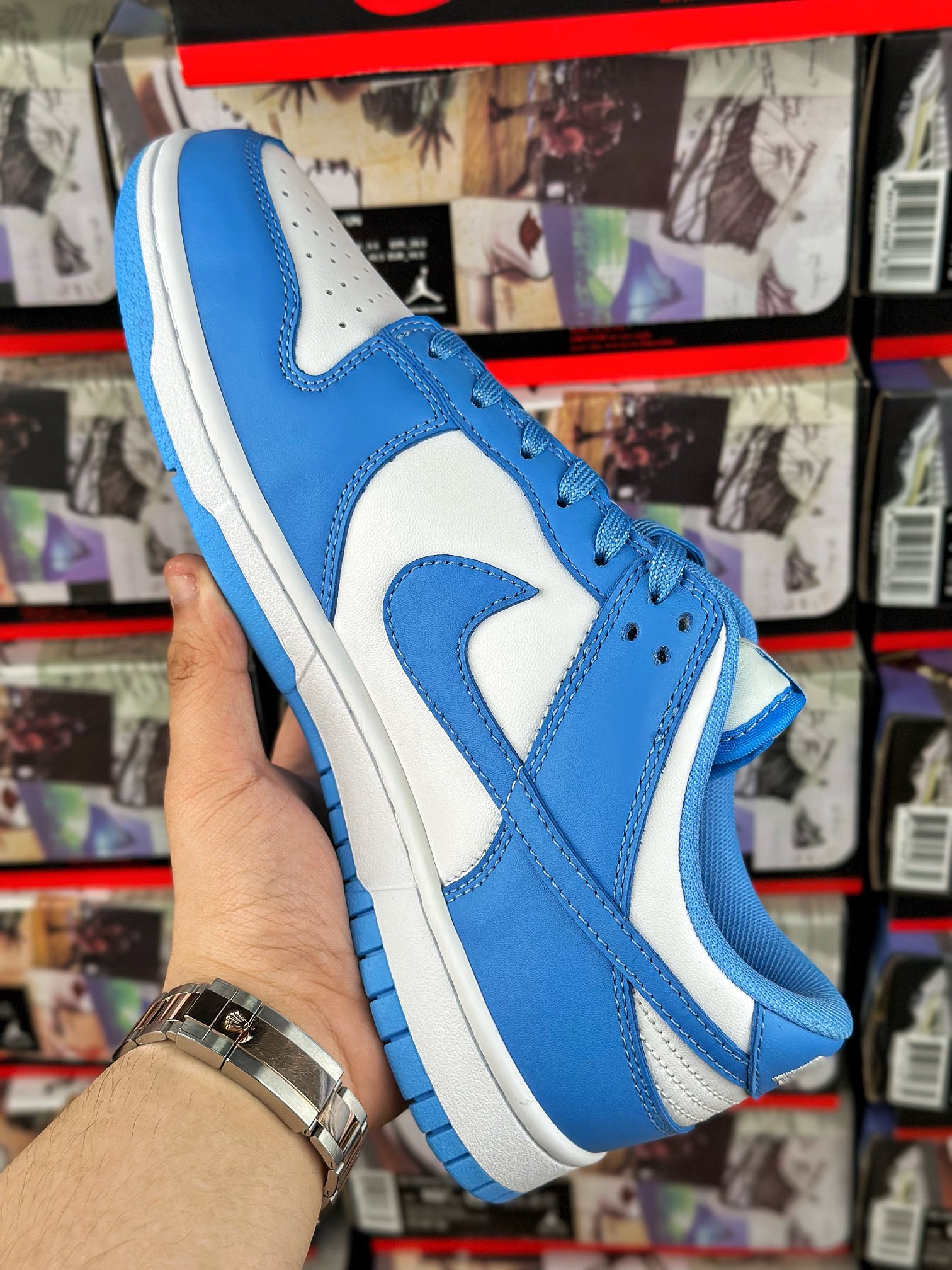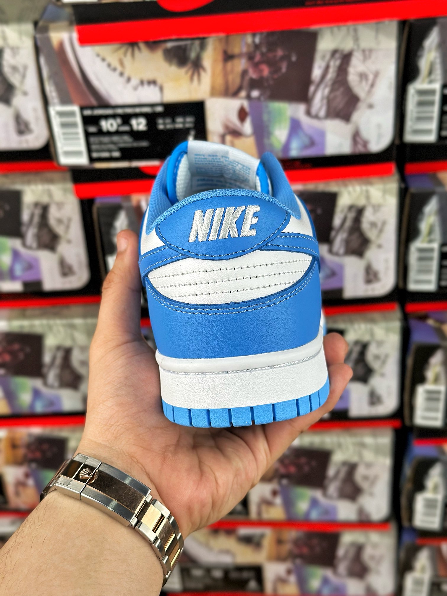 Tento pár Nike Dunk Lows má klasický dvoubarevný design, který mu dodává styl dědictví. Jeho retro vzhled začíná na gumové jednotce podrážky, která je rozdělena na bílou mezipodešev a univerzitní modrou podrážku. První z nich je opatřena pásem prošití, které probíhá v drážce po celém obvodu, zatímco druhá má sadu přilnavých vzorků, které uživateli nabízejí dobrou úroveň trakce a podpory. Patří mezi ně soustředné kruhy, které napomáhají otáčení přední části chodidla, a robustní výstupky pod patou. Pod klenbou chodidla je velká členitá část s nápisem „Nike“ a nápisem swoosh, který z ní vystupuje.